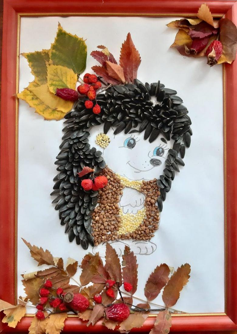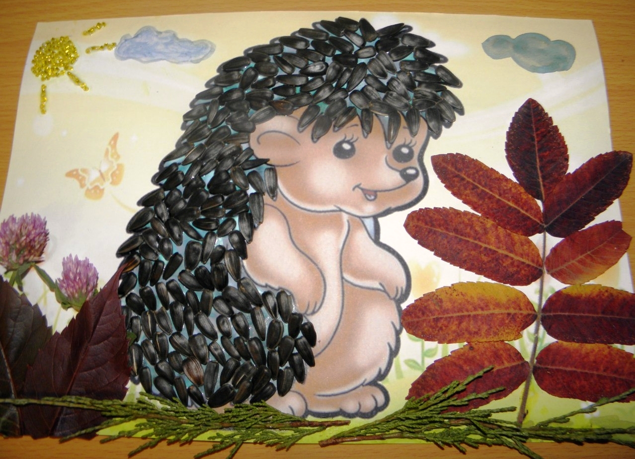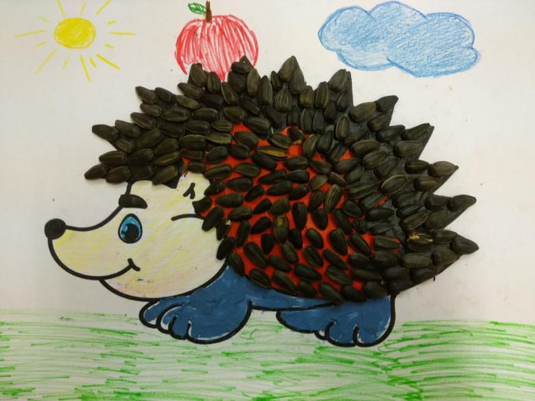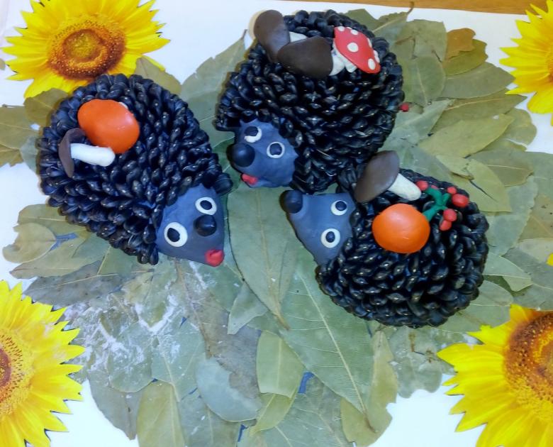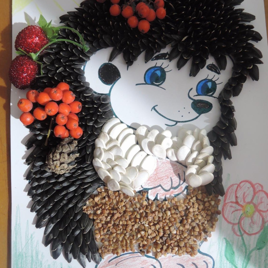 Il est facile de fabriquer un modèle de hérisson à partir de la citrouille et des graines de tournesol, en dessinant le corps de l'animal et en collant des spécimens noirs dans le dos. Les graines des aiguilles sont une représentation réaliste de son "manteau" en forme d'aiguille.