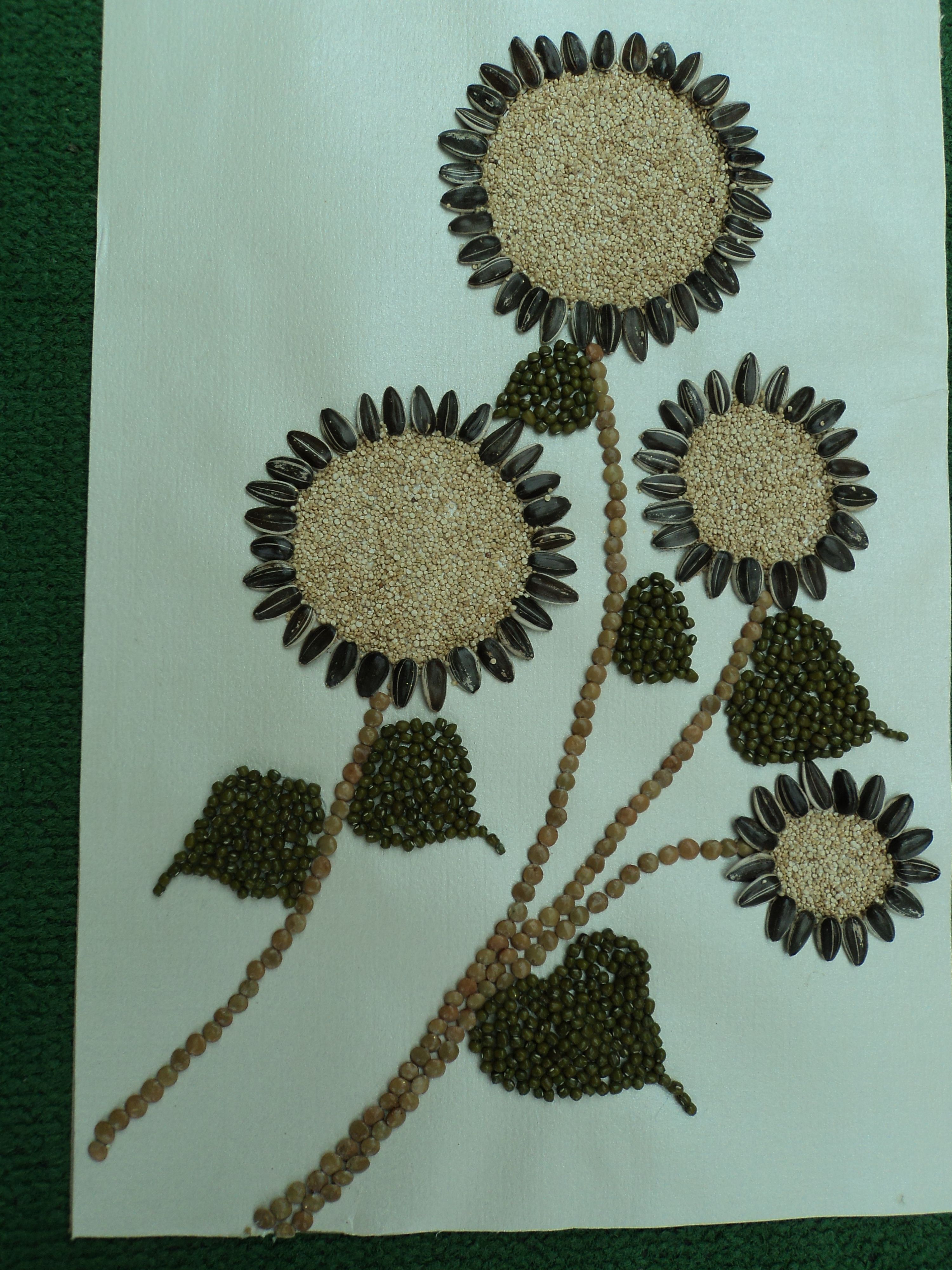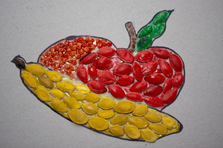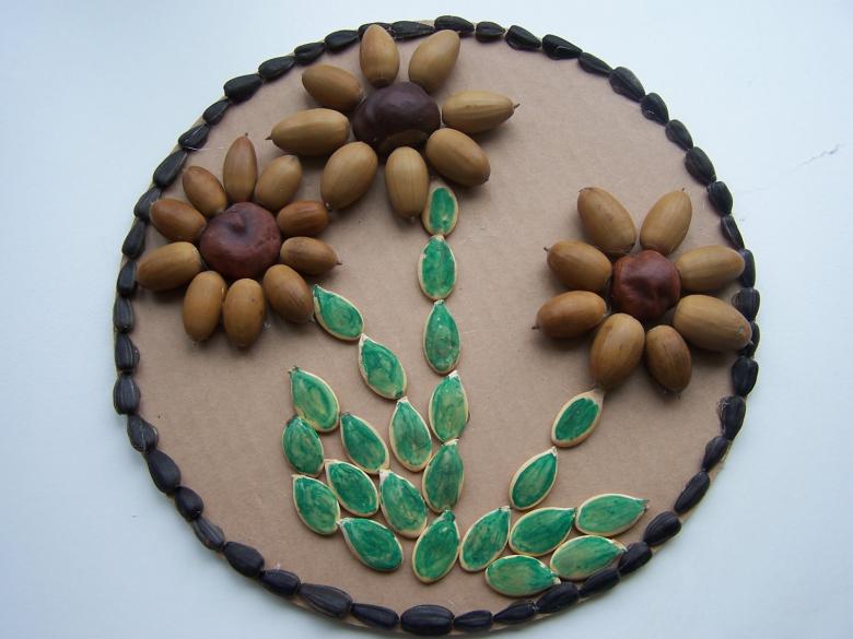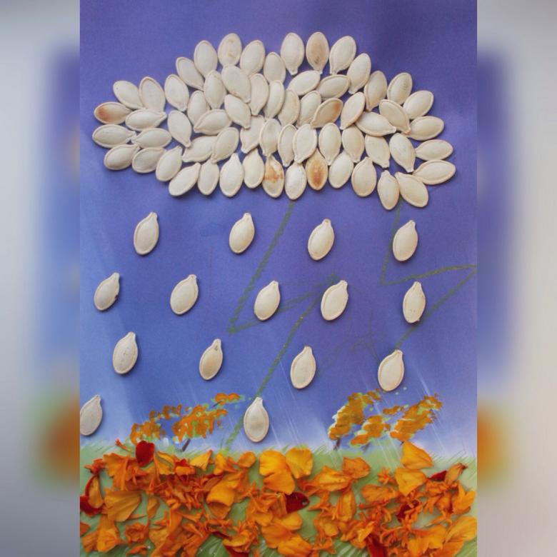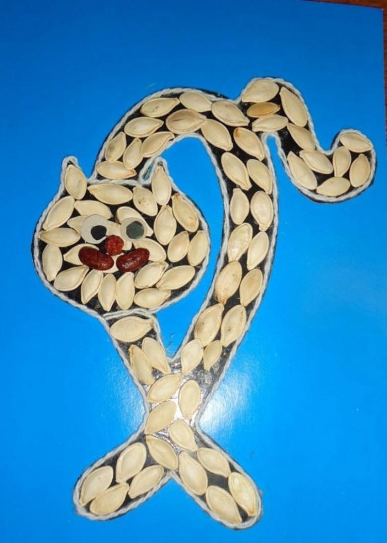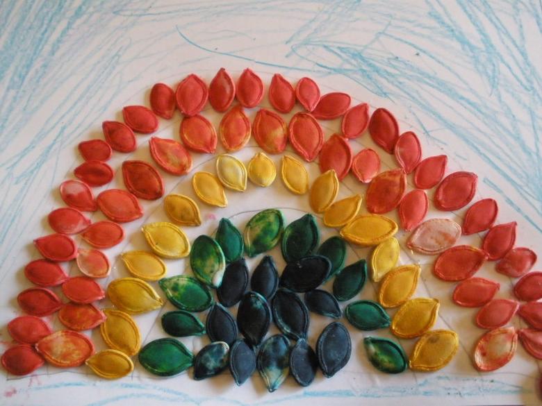 Les bricolages à base de citrouille, de graines de tournesol et de céréales ressemblent à de superbes peintures murales. Il suffit de dessiner un tracé et de le recouvrir de fractions, en triant par couleur.