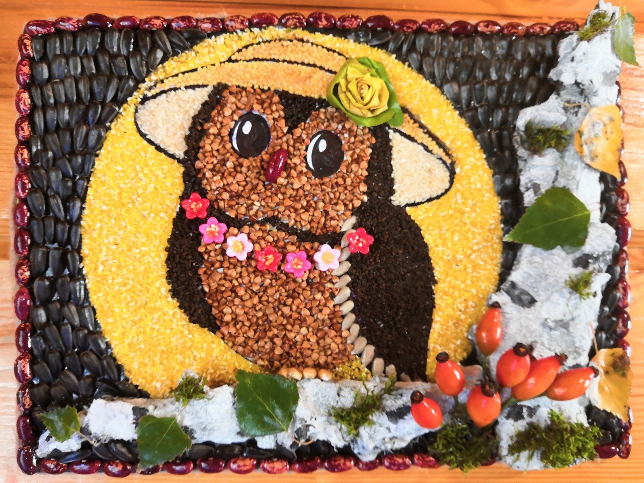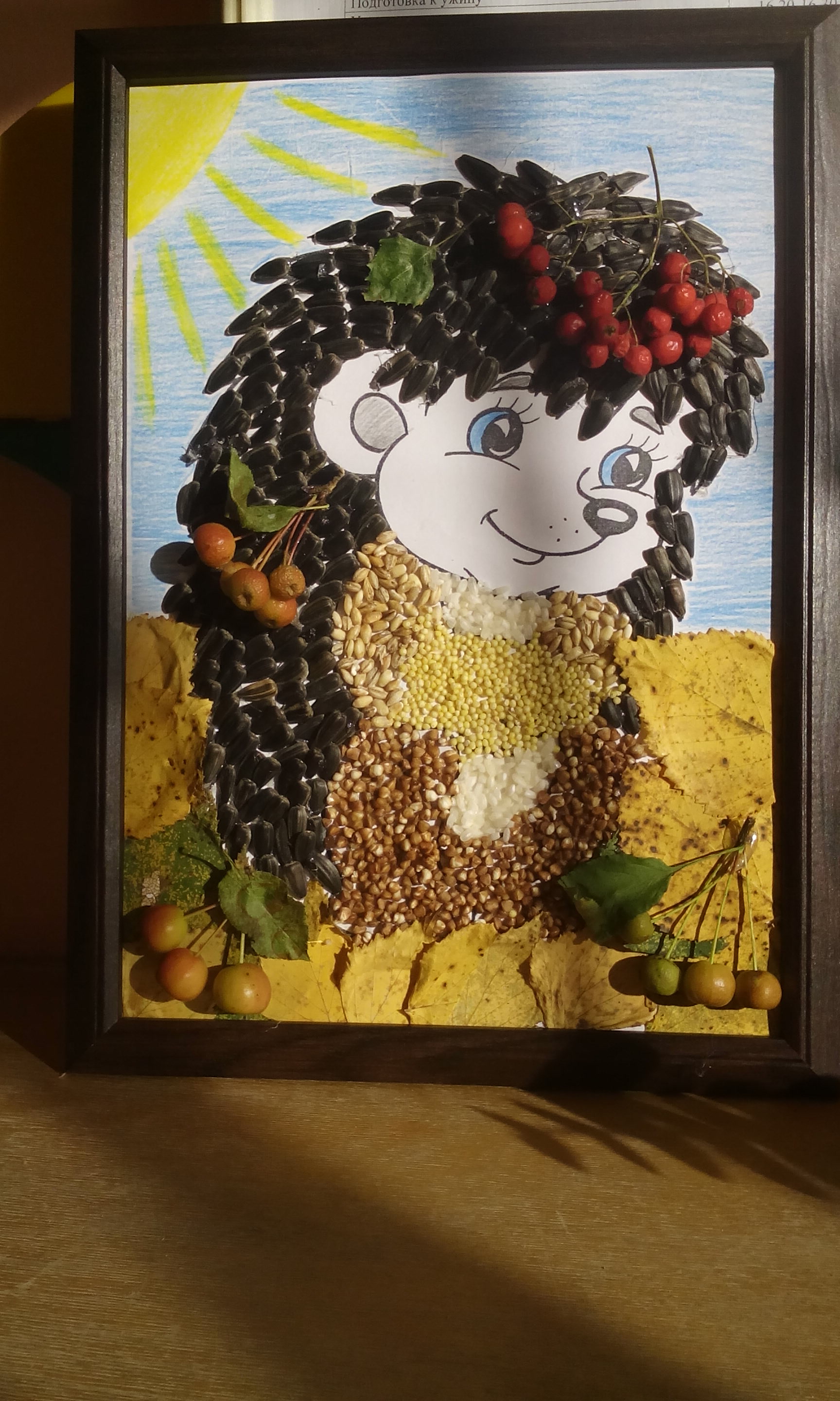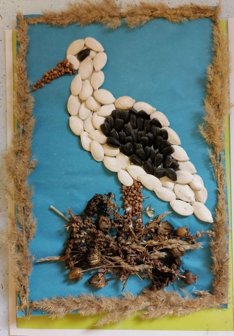 Les bricolages à base de citrouille, de graines de tournesol et de céréales ressemblent à de superbes peintures murales. Il suffit de dessiner un tracé et de le recouvrir de fractions, en triant par couleur.