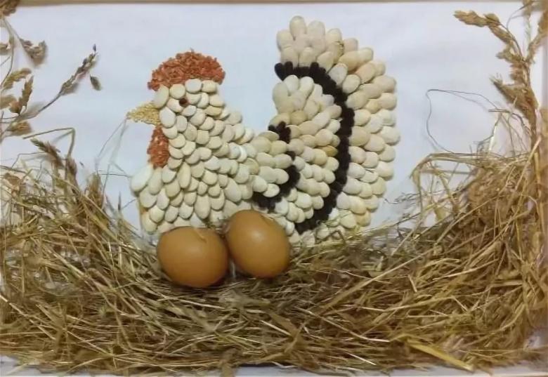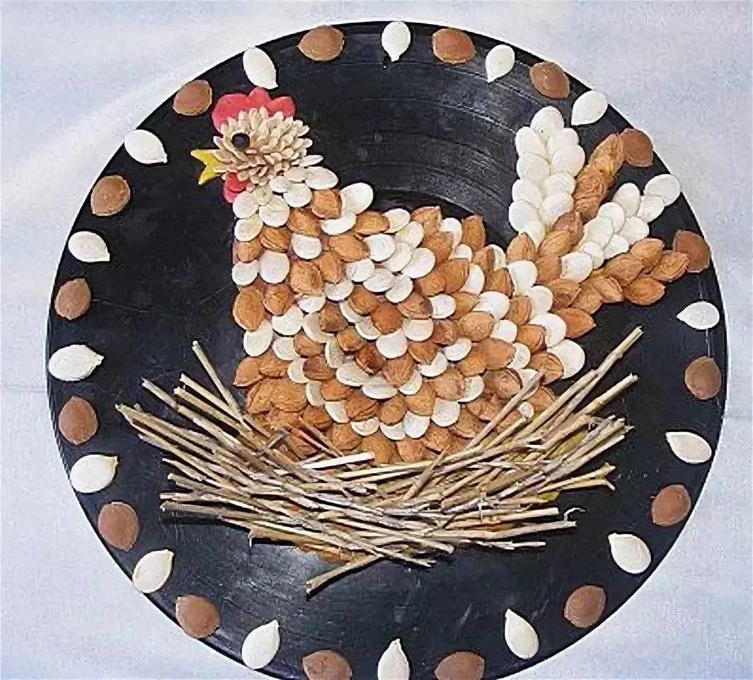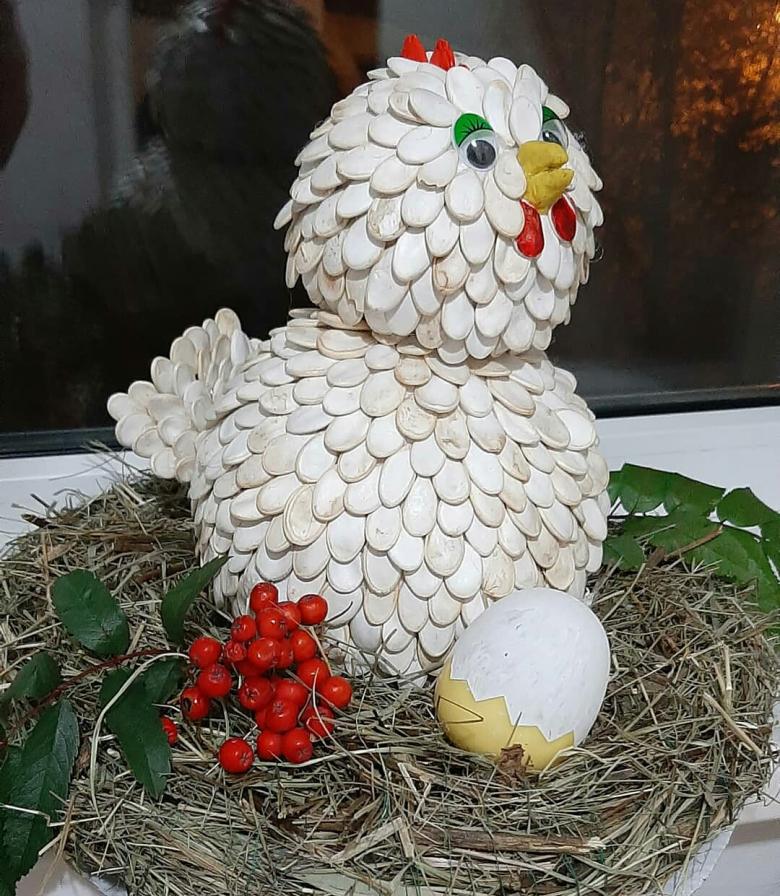Une jolie chouette est fabriquée en équipant une citrouille ou une courgette miniature de graines de plumes tout autour sans interstice. Les yeux sont de gros boutons. Une jolie poule avec un bec et une coquille en pâte à modeler, assise sur des œufs.