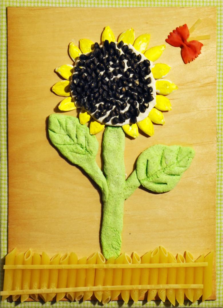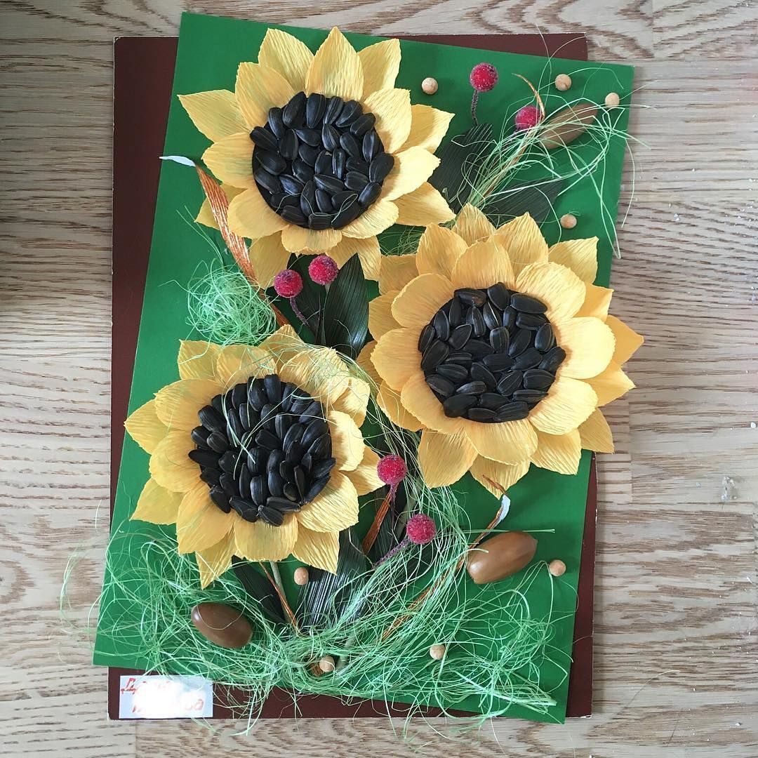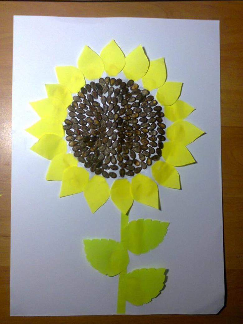 Il suffit de fabriquer une muselière et de coller un champignon ou une baie sur le dessus. Le tournesol a un aspect spectaculaire. Vous aurez besoin de pétales de papier jaune collés sur un cercle de carton, et d'une tige verte. Le milieu est rempli de matériau noir. Une assiette jetable peut jouer le rôle de socle.