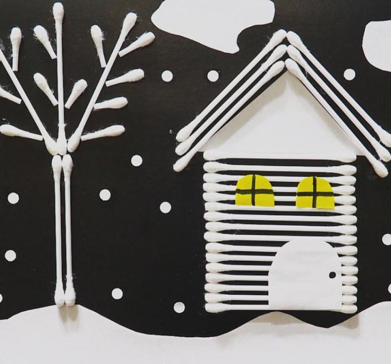 Par exemple, vous pouvez créer un lac à partir d'un disque de coton et découper des oiseaux ou des cygnes. Recouvrez le lac lui-même de bleu et ajoutez un soleil au sommet à partir du même disque d'ouate. En plus du lac et du soleil, vous pouvez également découper un disque d'ouate en forme d'herbe et le colorer. Vous pouvez également construire des maisons en papier à partir de coton-tiges,