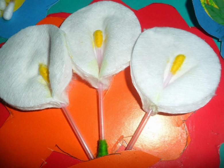 Donc, comme vous pouvez le voir dans le sujet de la revue, nous allons travailler avec des matériaux de type ouate et disques de coton. Des matériaux assez simples et primitifs, que l'on peut trouver dans chaque foyer. Les disques de coton peuvent être remplacés par de la ouate ordinaire. Une option de créativité lorsque les enfants veulent faire plaisir à leur mère est devenue le 8 mars.