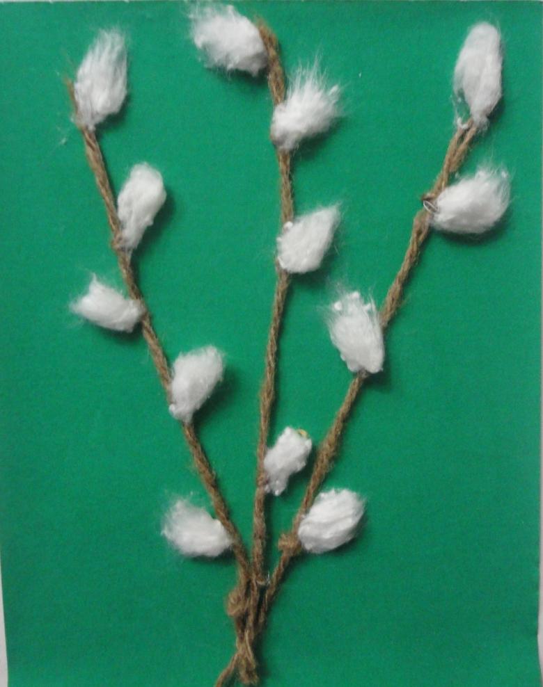 - Coupez trois brins dans un écheveau de fil ou de ficelle, collez-les sur la base. Si vous le souhaitez, vous pouvez faire des nœuds sur les branches de la ficelle à l'endroit où les boutons de coton doivent apparaître. L'appliqué sera plus efficace de cette façon.
