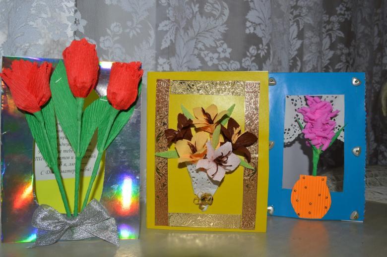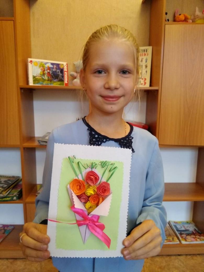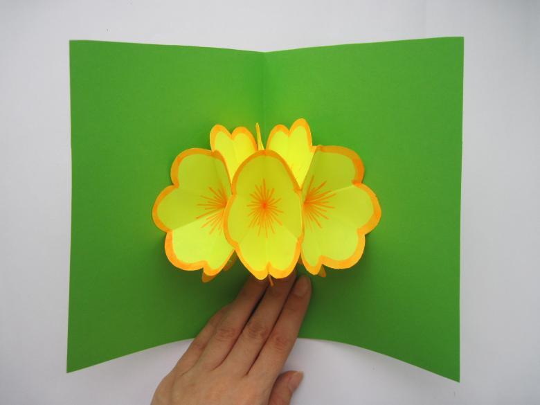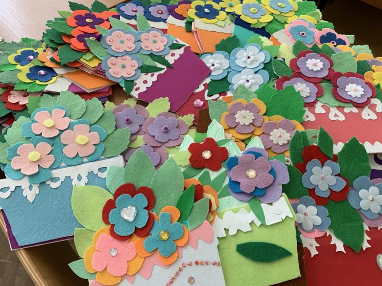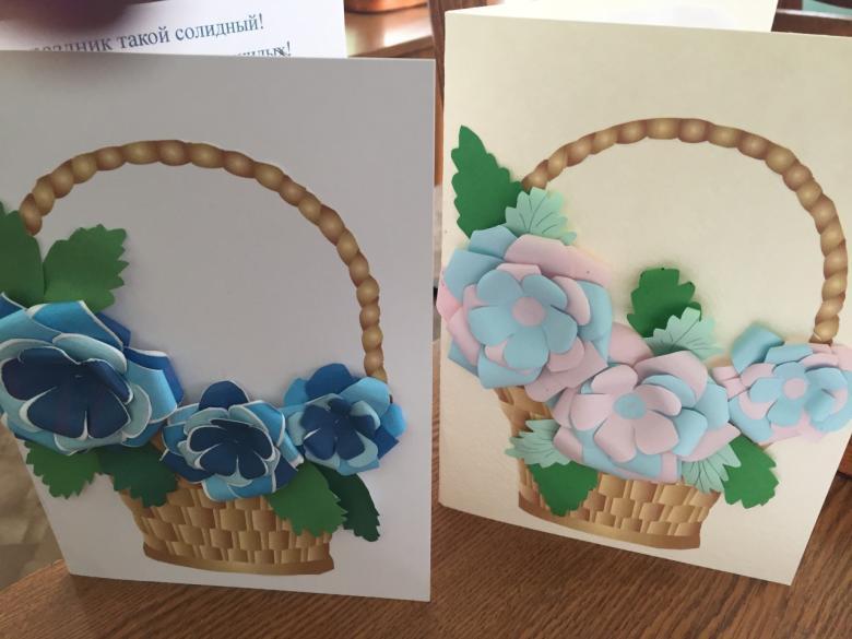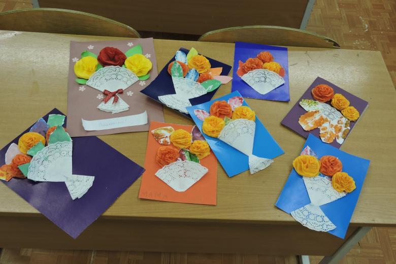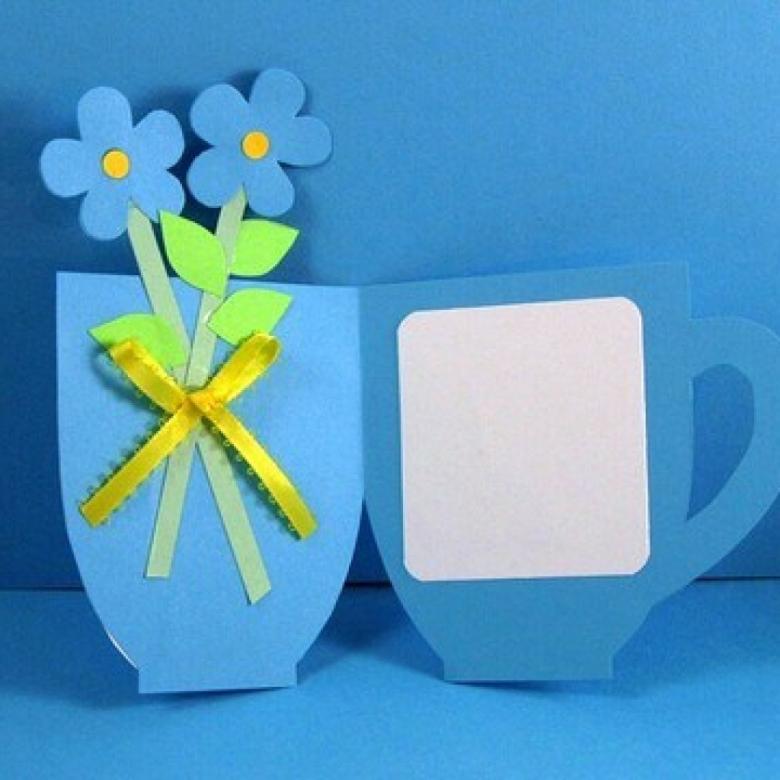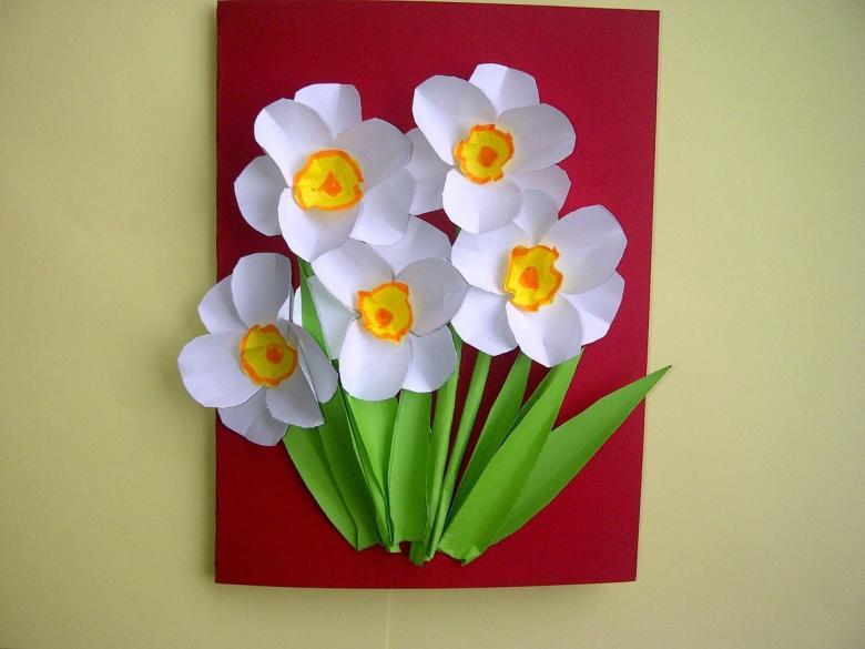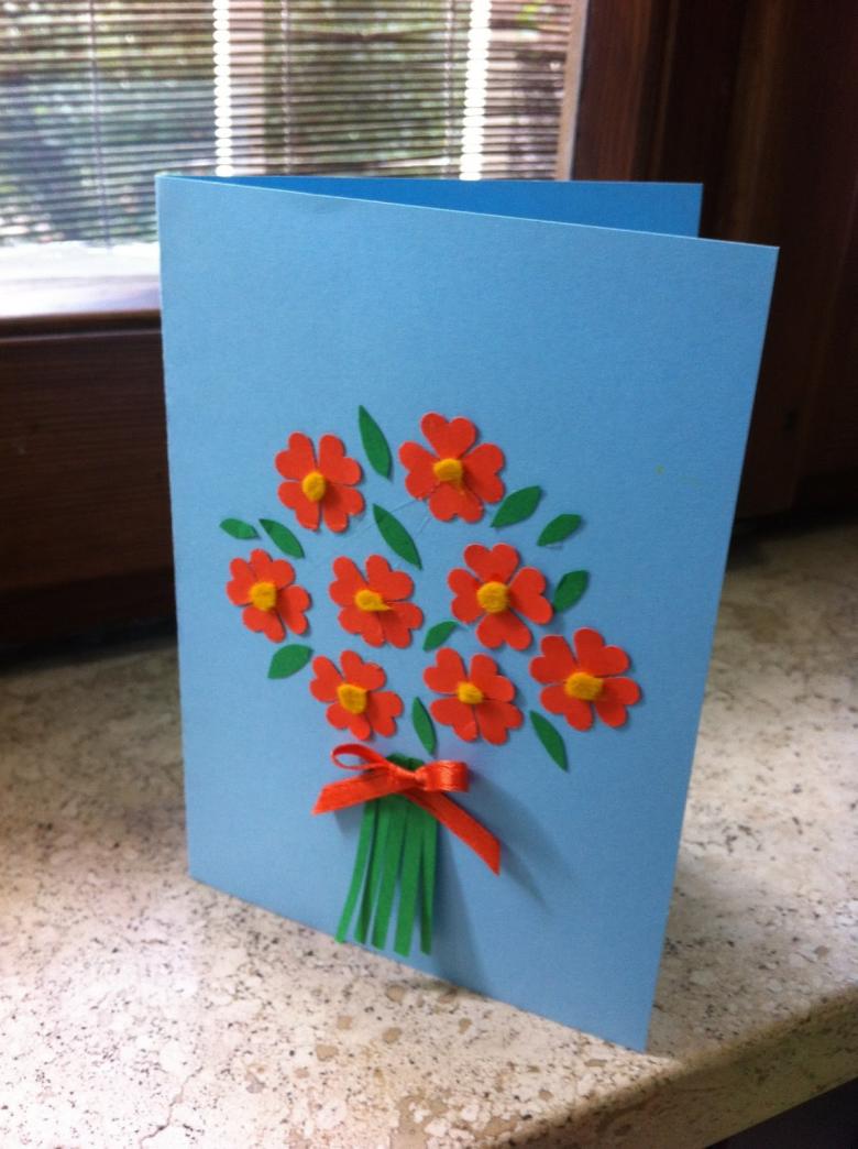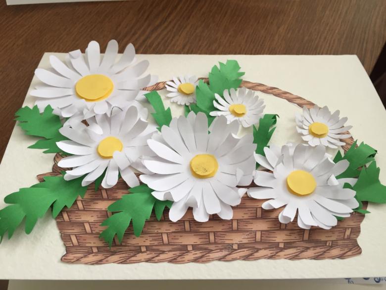 Une autre option est une carte de vœux avec des fleurs tridimensionnelles. Tout élève peut le faire. Matériel nécessaire : papier de couleur, feuille de carton de format A4, colle PVA, gabarits de vase, de feuilles et de fleurs.