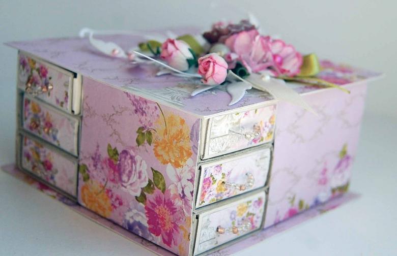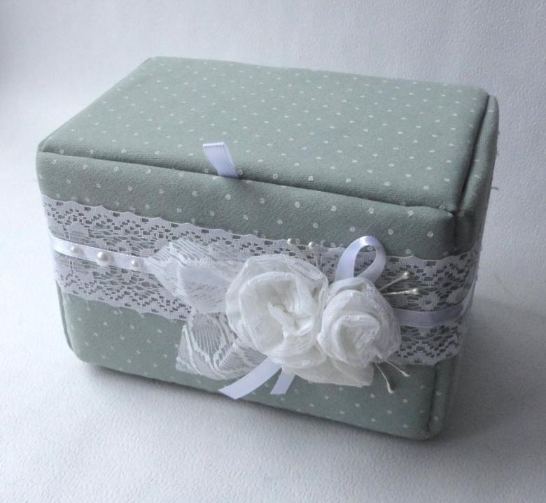 Enveloppez la boîte dans du papier autocollant et décorez-la avec des strass, des perles, de la dentelle, des fleurs en papier ou séchées, des graines ou des rubans. Ensuite, vous devrez vernir l'article pour lui donner une finition durable.