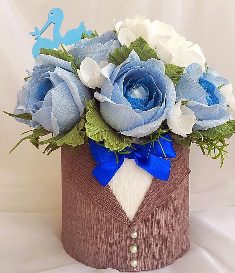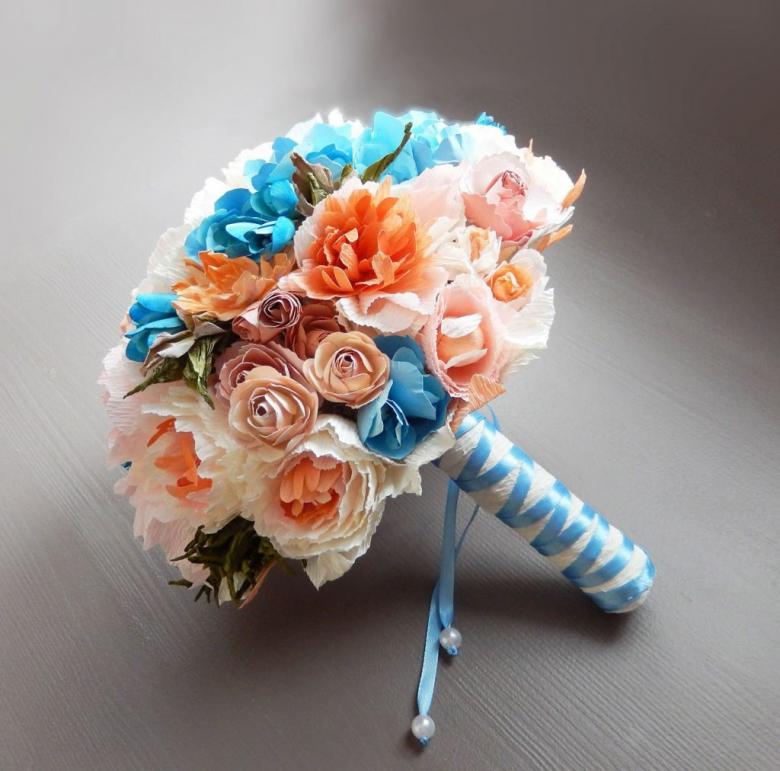 Ces bouquets peuvent être réalisés assez rapidement. Pour ce faire, découpez de petits rectangles dans du papier ondulé pour former des pétales. Les ébauches sont enroulées sur un crayon, délicatement pressées ensemble, puis étalées pour former de véritables pétales. Les pétales sont combinés pour former un modeste bouton ou une fleur luxuriante. Attachez une ficelle autour du bas de la pièce.