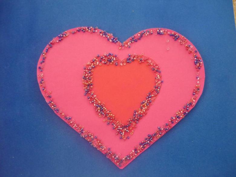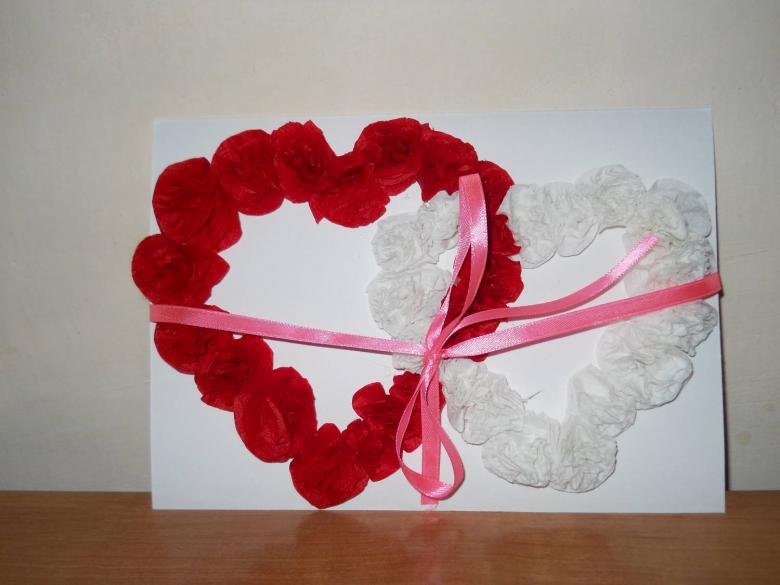 Les plus petits cœurs des deux couleurs sont collés ensemble, tandis que les plus grands sont collés sur les moitiés intérieures de la carte. Maintenant, lorsque l'objet artisanal est déplié, les cœurs sont disposés en un ruban continu.
