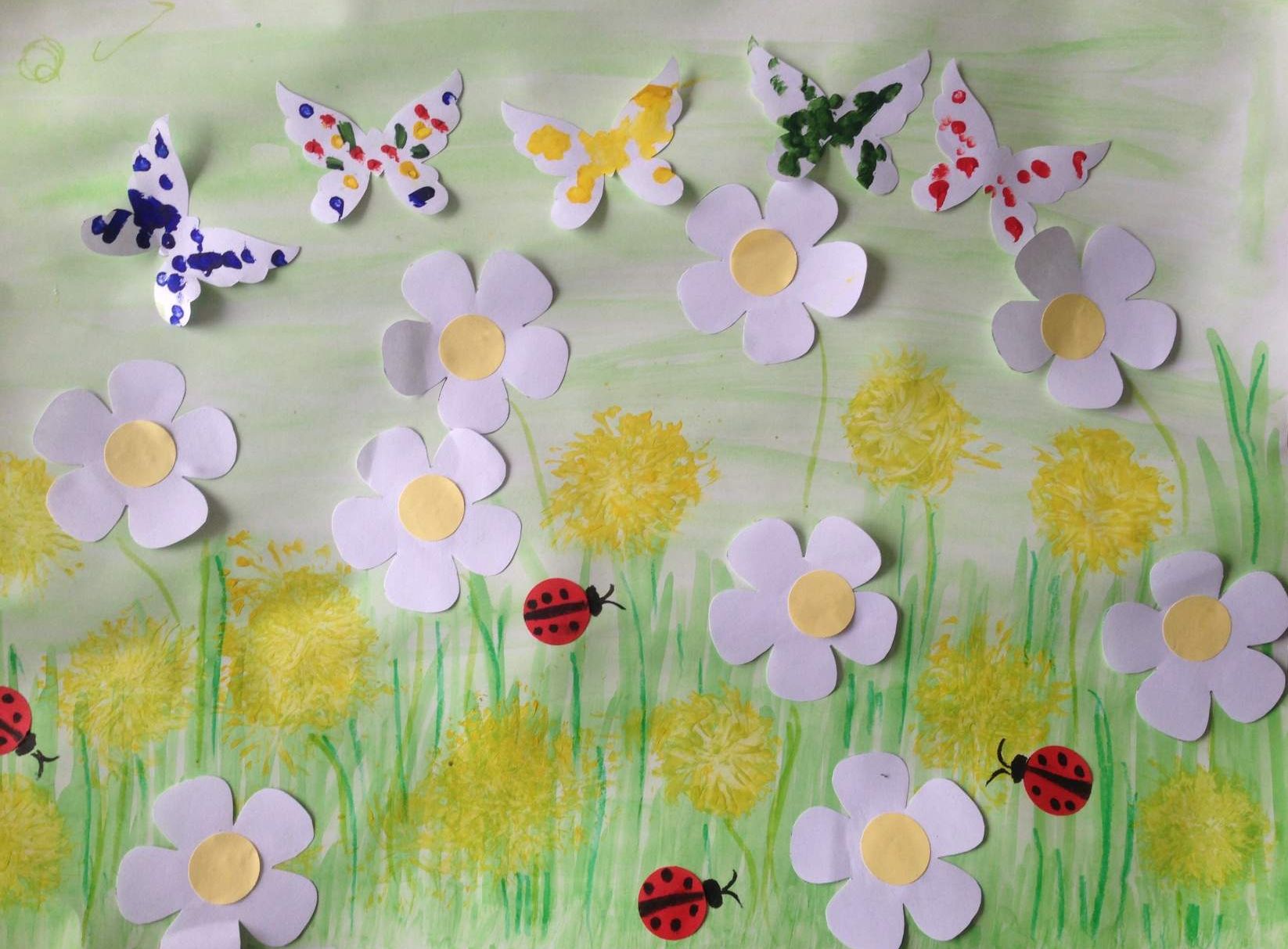Ensuite, décorez le ciel. Les pissenlits sont utilisés pour former un cercle et les rayons de notre futur soleil et les fleurs blanches sont utilisées pour créer des nuages. Pour créer des nuages. Ils peuvent être de tailles et de formes différentes.