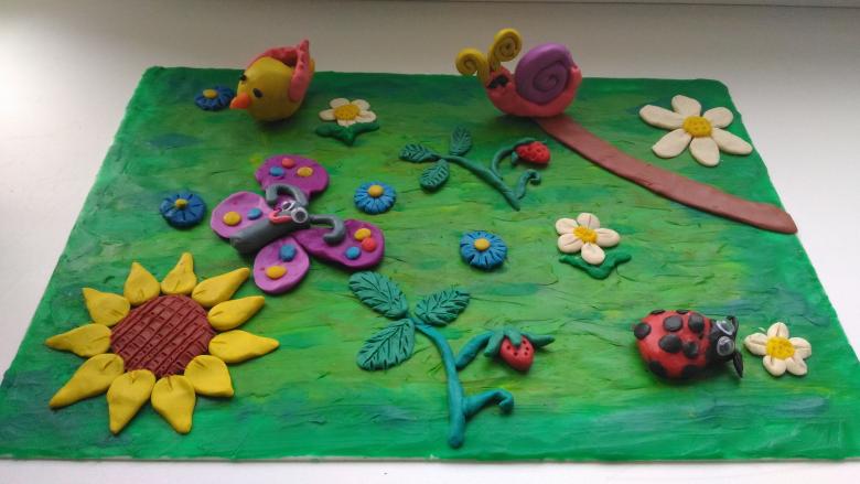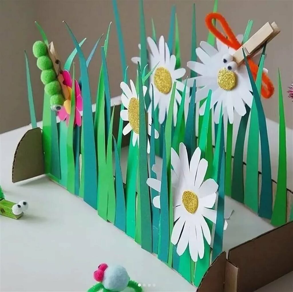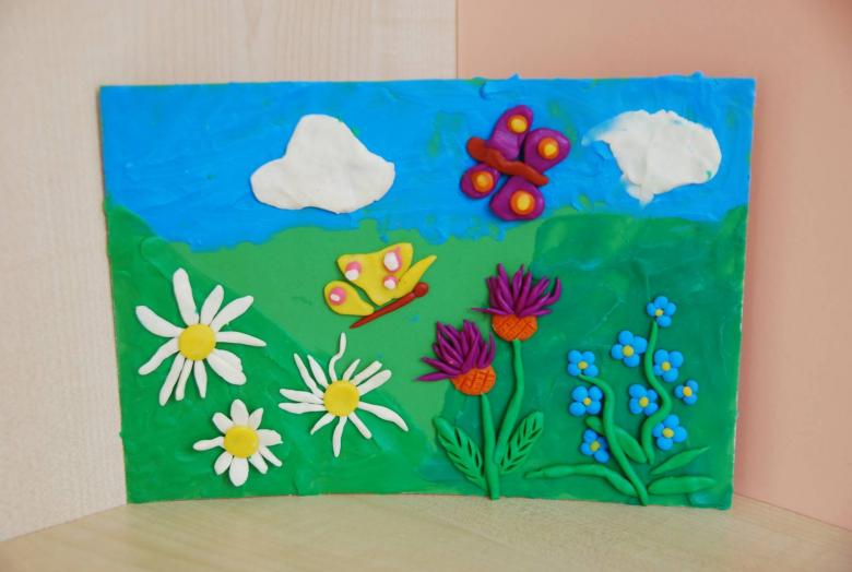 Le carton vert servira d'arrière-plan. Découpez des herbes, des fleurs, des rayons de soleil et des nuages dans du papier de couleur et collez-les sur le carton. Vous pouvez découper une bande de papier de couleur bleue et créer un fond bleu - le futur ciel.