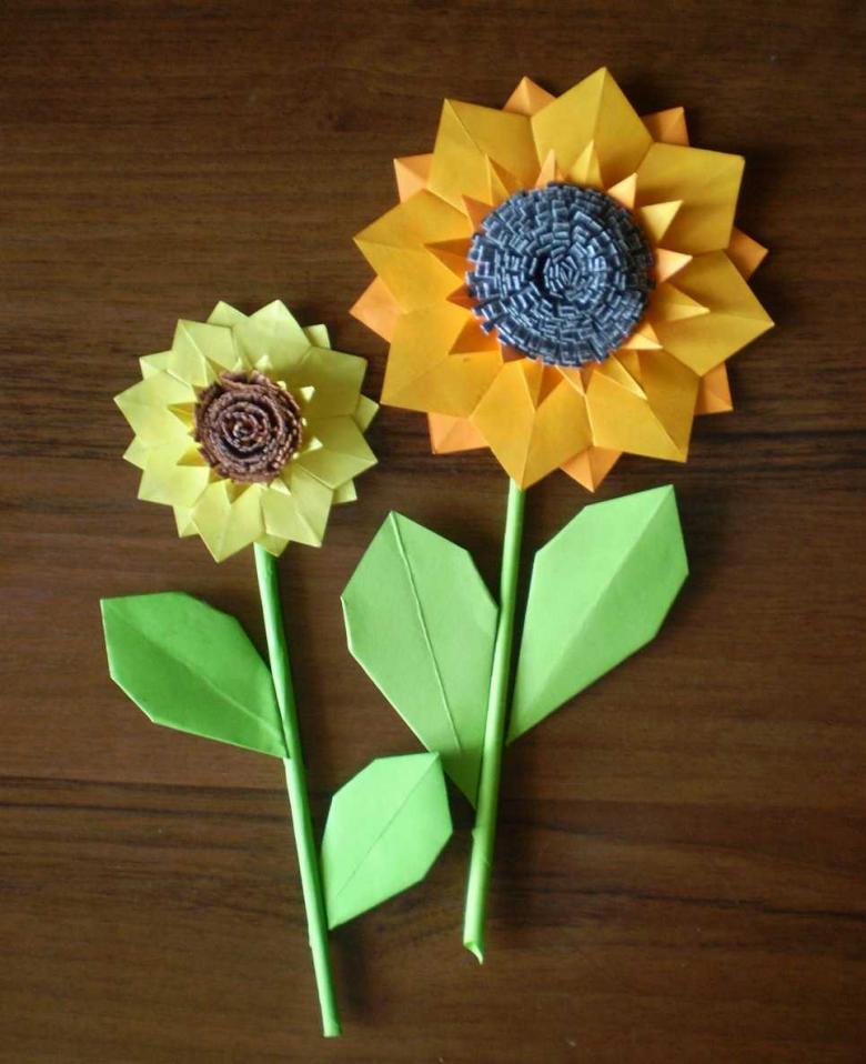 Ensuite, commencez à fabriquer les parties de la plante. Utilisez du papier de couleur verte pour découper la tige et les feuilles. Utilisez du papier jaune pour les pétales. Le papier orange convient au futur cœur.