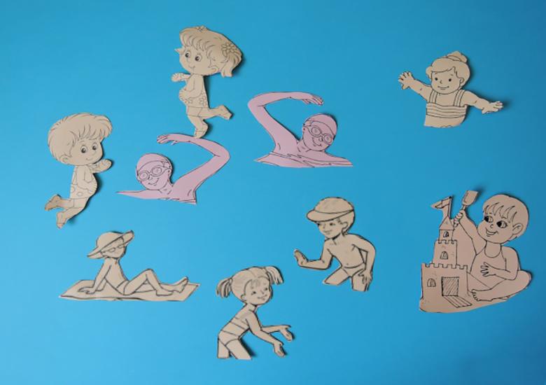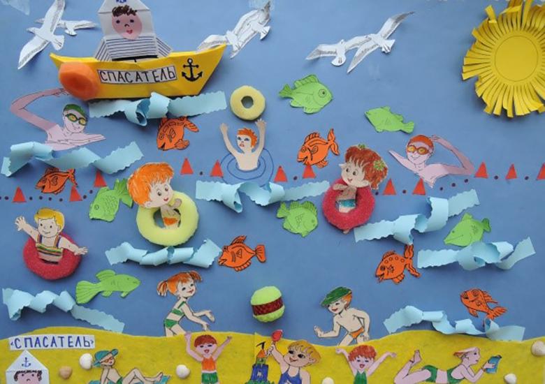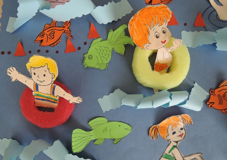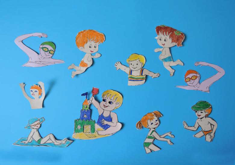 Le carton est utilisé comme base pour l'applique. C'est sur elle que sont collés tous les détails nécessaires. D'abord, vous devez prendre le papier de couleur bleue. Coupez-le ensuite en longues bandes irrégulières (elles représenteront l'eau de la piscine). Après ça, coupez les nageurs. Leur visage sera un cercle blanc, leur corps - un petit rectangle de n'importe quelle couleur, leurs mains - des bandes blanches.