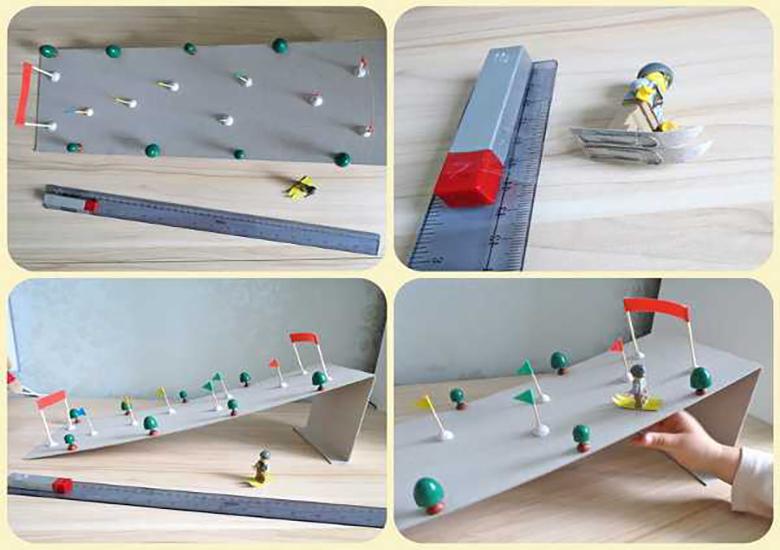 Le papier de verre est un matériau de couleur sombre qui ressemble beaucoup à une surface de stade pour le jogging. Une éponge à vaisselle ordinaire fait une excellente imitation d'un tapis de sport. Une fine paille de cocktail peut devenir la base d'une structure élaborée. Et les bâtons roulants peuvent être facilement transformés en barre de gymnastique.