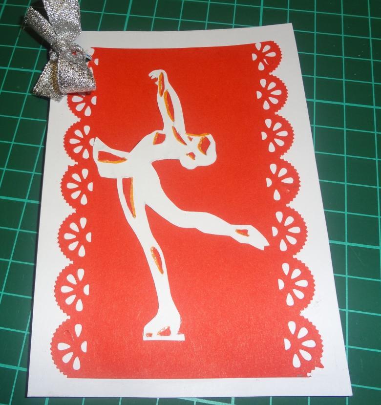 La plupart du carton est recouvert de bandes bleues. Au-dessus d'eux, des nageurs existants ont été soigneusement collés. Sur la partie vierge du carton, dessinez un juge, des spectateurs.