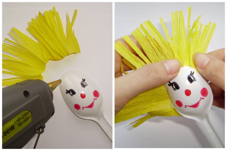 - Vous devez maintenant coiffer la poupée. Prenez un fil ou un fil épais et enroulez-le autour de votre main 3 à 4 fois. Il faut ensuite nouer au milieu et couper les extrémités du fil. Cette coiffure est ensuite cousue sur la poupée.