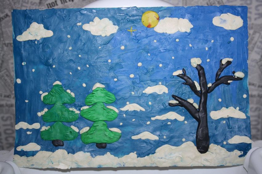 Un adulte dessine une composition simple sur un morceau de carton avec de la colle - une maison, un sapin de Noël, un arbre, le mois dans le ciel et les étoiles. Proposez à l'enfant de faire le "tour" et de saupoudrer du sel ou de la semoule sur toute la surface de l'image.