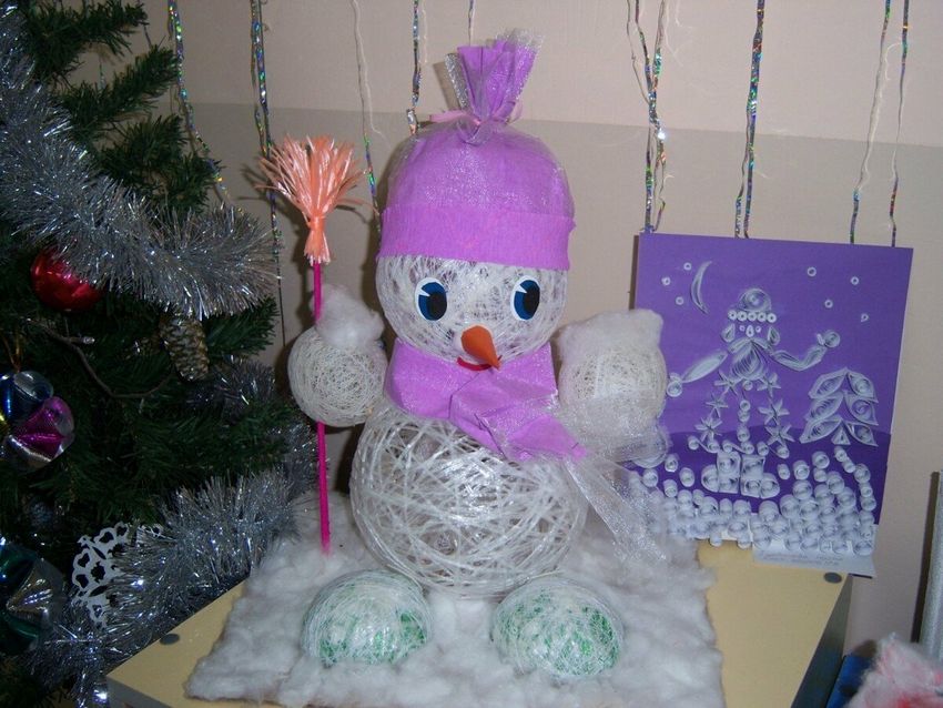 Avec des enfants plus âgés, vous pouvez réaliser une composition plus complexe - un bonhomme de neige en trois dimensions, qui serait un excellent bricolage pour le jardin d'enfants sur le thème de "l'hiver".