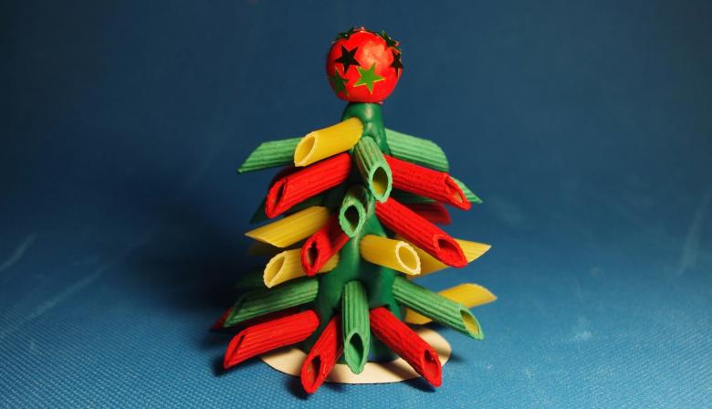 Une façon très originale de faire un arbre du Nouvel An à partir de ... macaronis ! Vous aurez besoin des choses les plus élémentaires : du papier, de la colle, de la peinture et le produit familier.