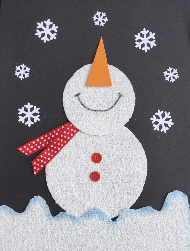 Collez les ouates, la base des bonhommes de neige, sur le carton. Découpez les autres parties des bonhommes de neige dans du carton aux couleurs appropriées :