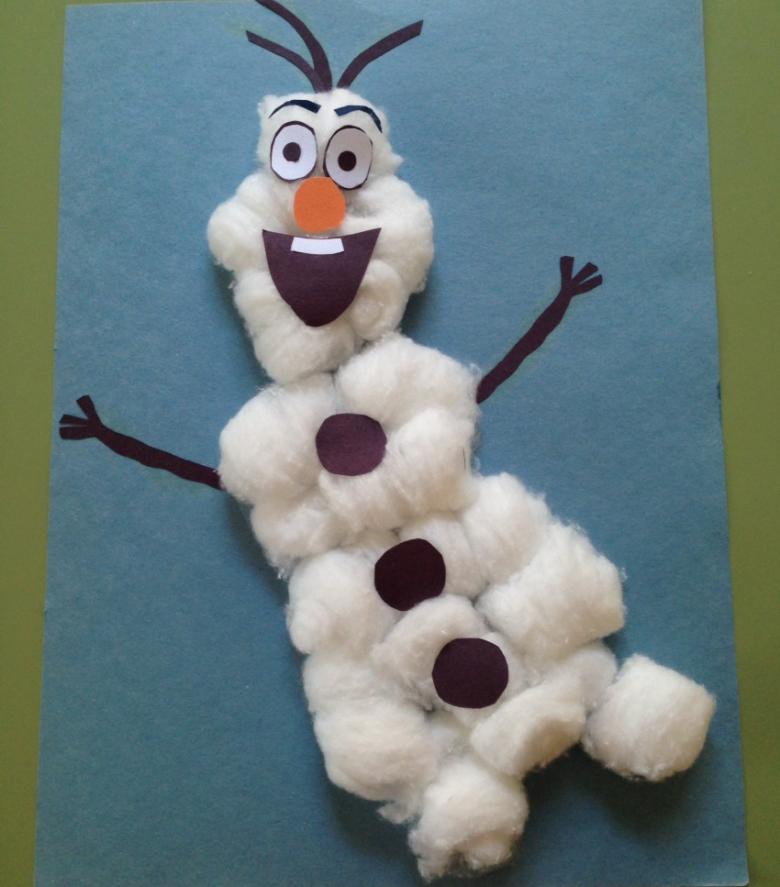 Tout le travail de collage des disques de coton et des parties "corps" et "outils" du bonhomme de neige peut très bien être confié à un enfant.