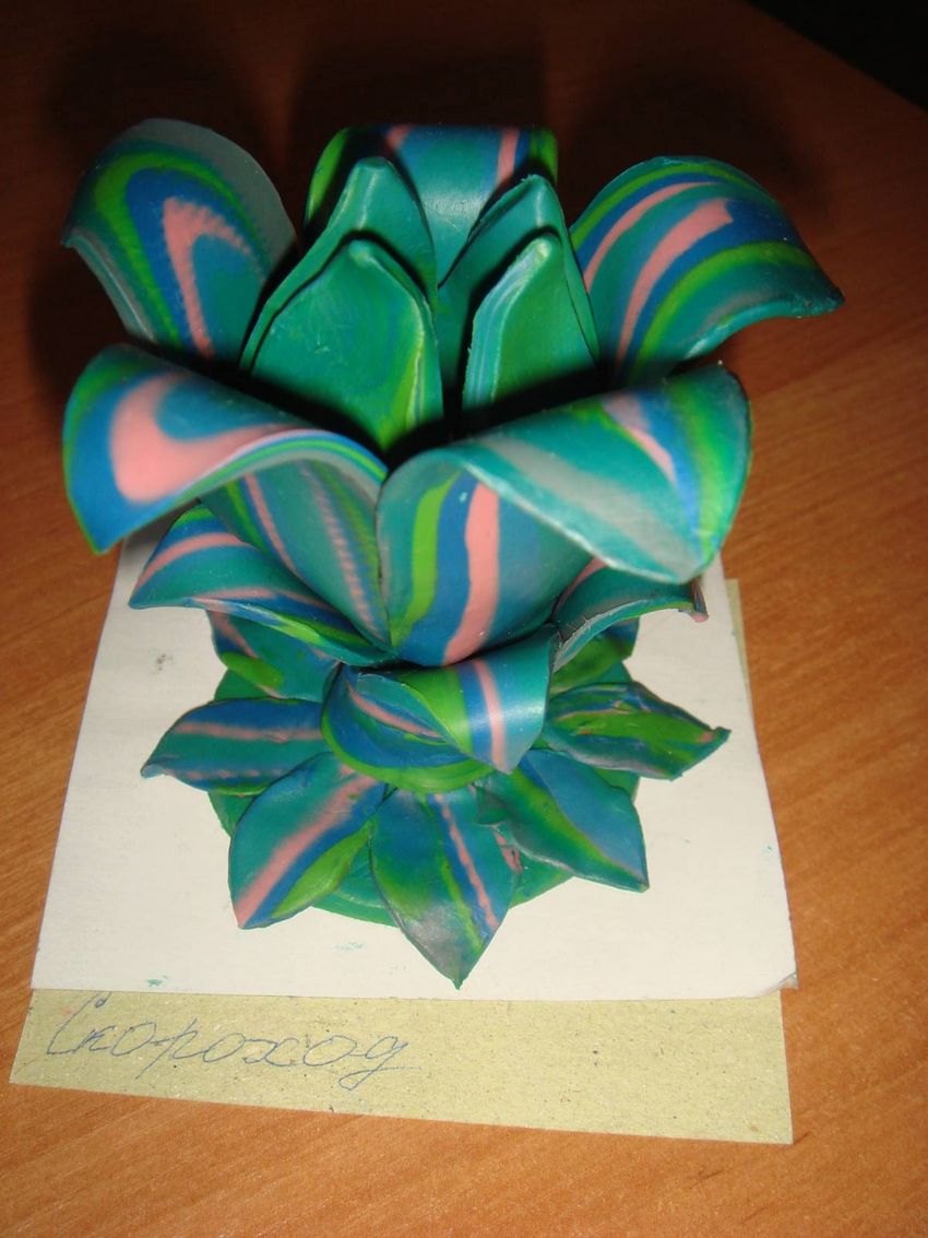 Pour la décoration, vous devez préparer du plastique, de la colle de couple et des épingles. Le fond de la structure sera doté de petites feuilles qui assureront la stabilité. Le pistil et l'étamine sortiront à l'intérieur de l'accroc, rendant la fleur de pierre brillante et belle.