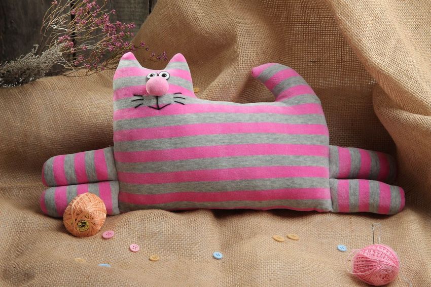 Il n'y a rien de compliqué à fabriquer un simple coussin. Vous aurez besoin d'une pièce rectangulaire de tissu dense de 128*63 cm. Vous devez coudre 3 côtés complètement, et 1 - pas complètement. Ensuite, vous devez retourner la pièce, la remplir avec du mastic et coudre manuellement la zone non cousue.