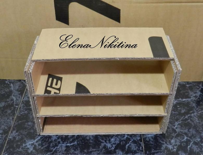 Pour fabriquer un meuble à chaussures en carton, vous avez besoin d'une boîte en carton d'une taille appropriée. Coupez-la en deux morceaux avec le fond scotché. En utilisant l'autre boîte, renforcez tous les murs. Ensuite, découpez les étagères et fixez-les dans la boîte. Le produit fini est décoré avec du papier ou du film décoratif.