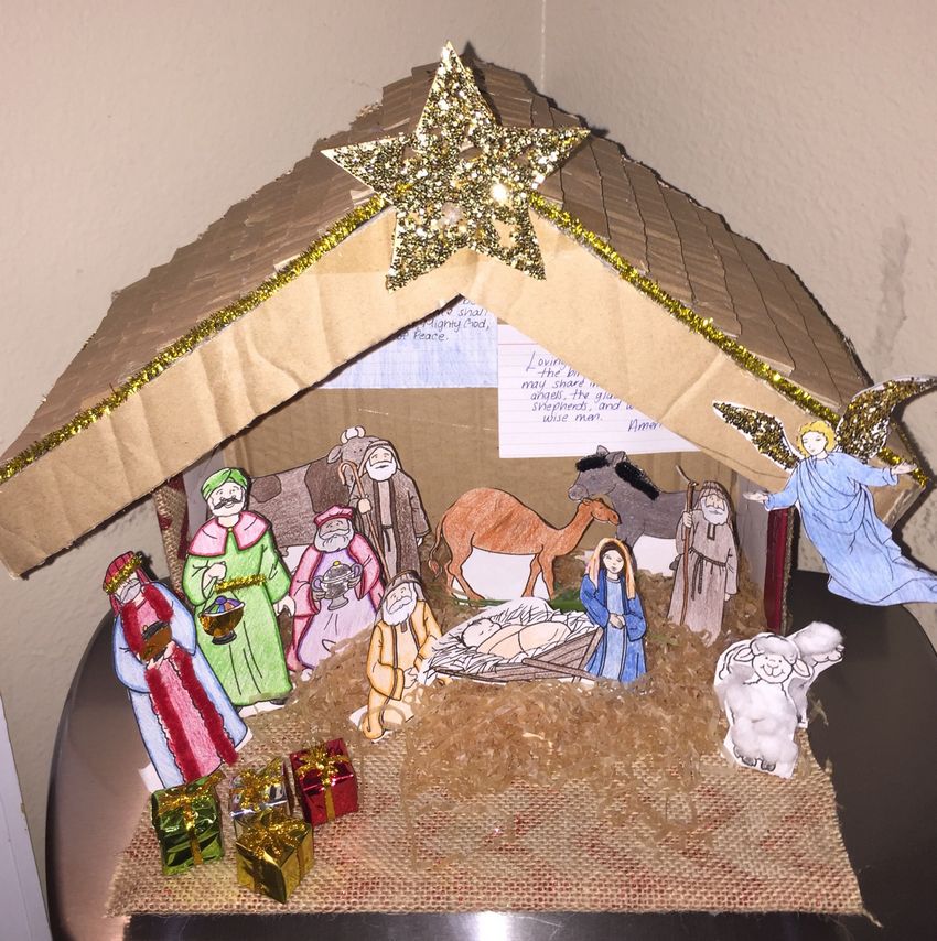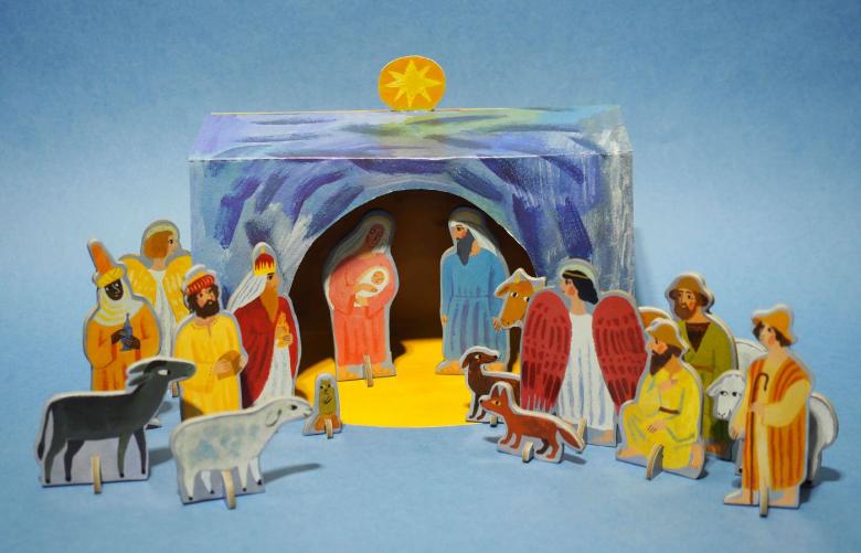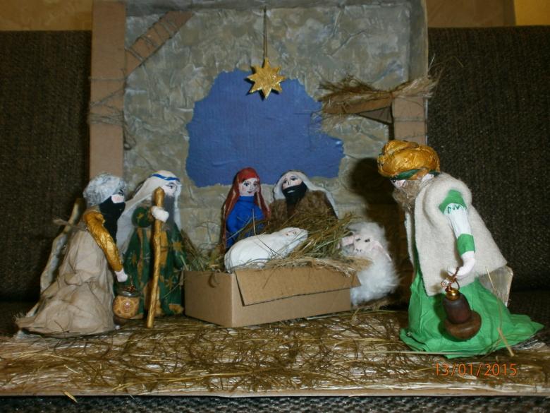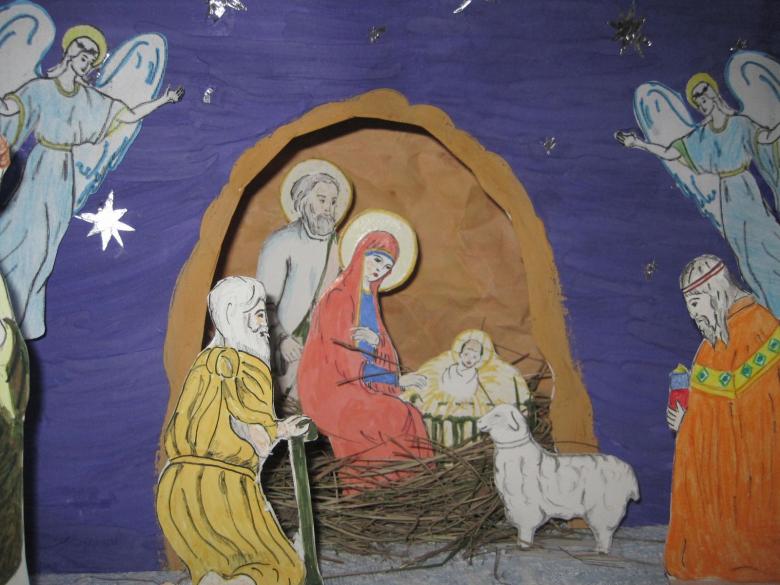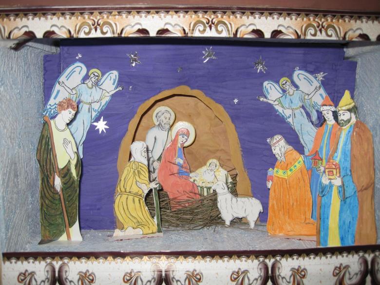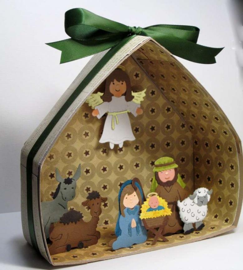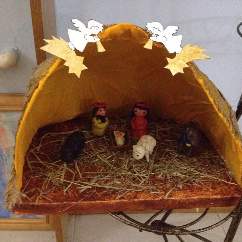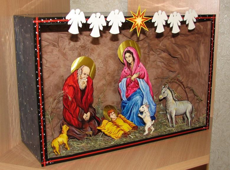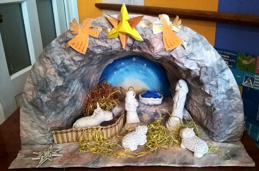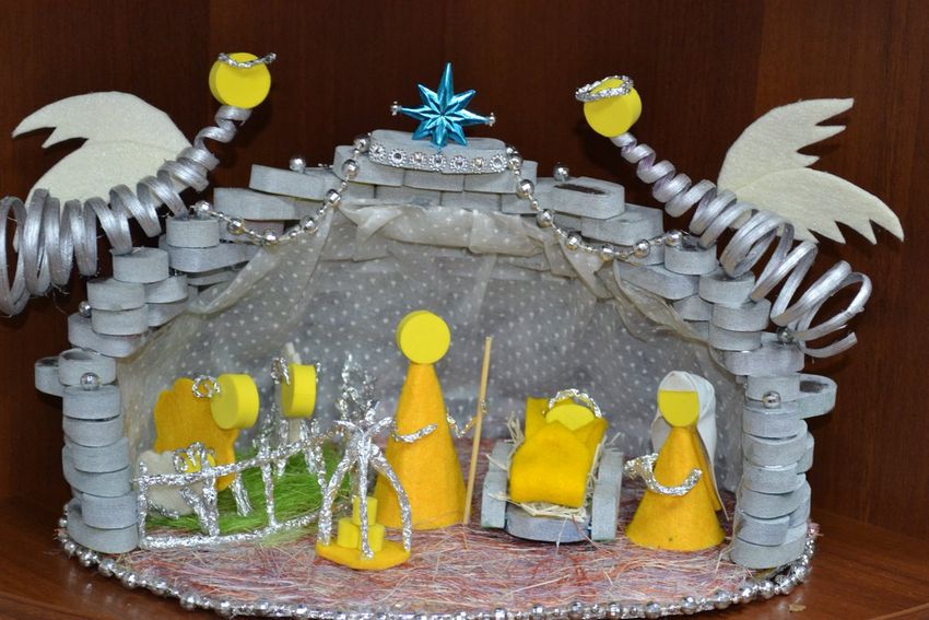 Une crèche en papier. C'est le papier qui est le plus facile à travailler. Découpez les figures de Jésus, de la Vierge Marie, des animaux, des bergers, des anges et des mages, en trouvant un modèle prêt à l'emploi sur internet. Fabriquez une grotte en carton et placez-y les personnages, en fixant l'ensemble de la structure avec de la colle. Ensuite, choisissez les couleurs pour le dessin de la grotte de Bethléem et collez-le avec du papier de couleur appropriée.