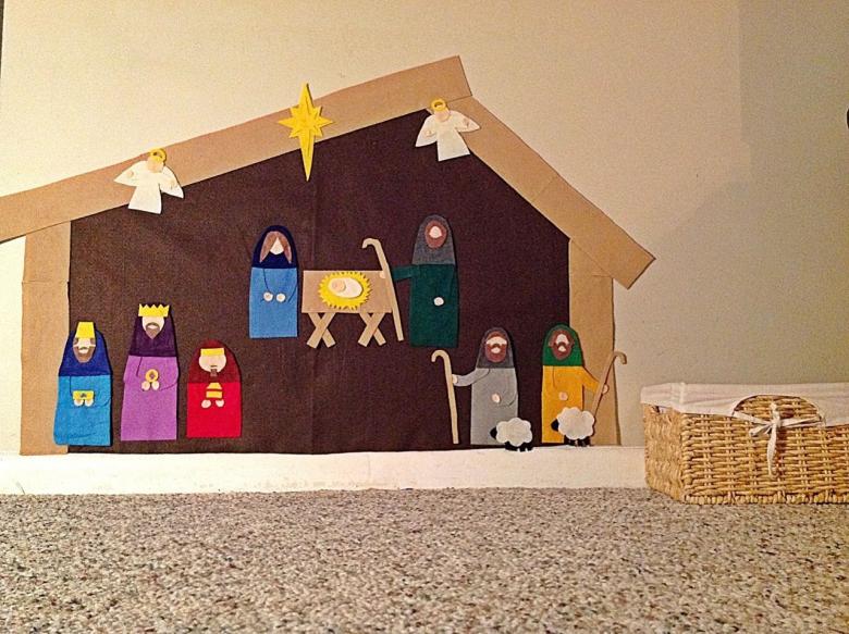 Une crèche en tissu. Si vous êtes prêt à donner un peu plus de temps et si vous pouvez travailler au feutre, ce serait un excellent choix. Ce type de crèche est plus minimaliste et ordonné. Fabriquez des poupées en fonction de la taille de votre paume et ajoutez des yeux avec des perles.