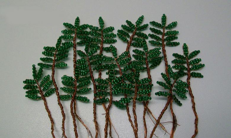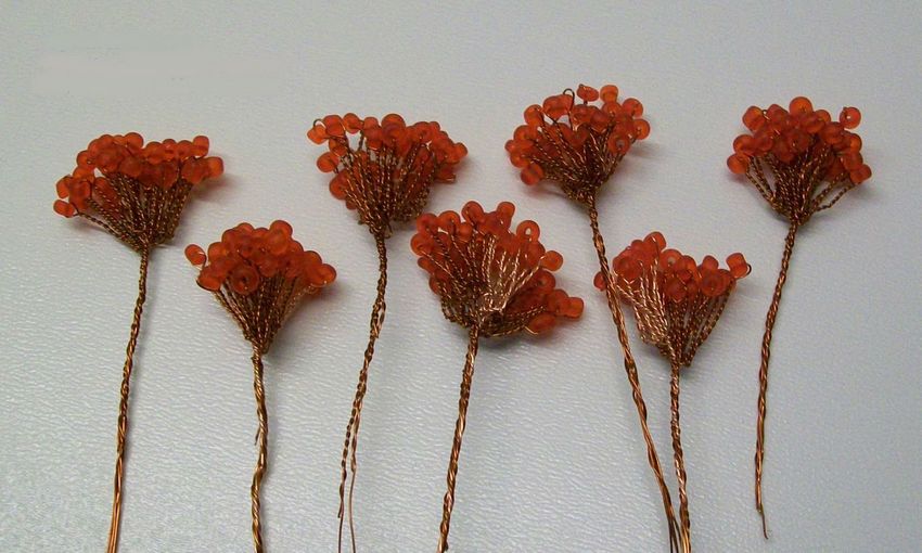- Prenez 25 cm de fil de fer. Un élément rouge est posé sur la base et tordu au moins 10 fois, jusqu'à ce qu'une distance de 1 cm soit atteinte. Avec cette méthode, vous faites un bouquet avec 7, 9 et 11 perles de verre. Plus il y a de perles, plus la création est massive ;