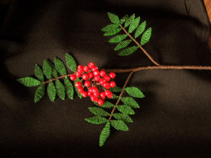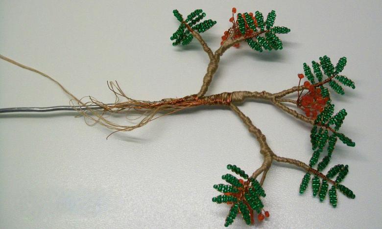 Les branches du sorbier sont formées. Pour ce faire, la grappe est torsadée avec une feuille. Après avoir reculé, une nouvelle feuille est vissée sur le rameau. Sept brins de sorbier identiques sont créés. Tous sont enroulés autour d'un fil à la base.