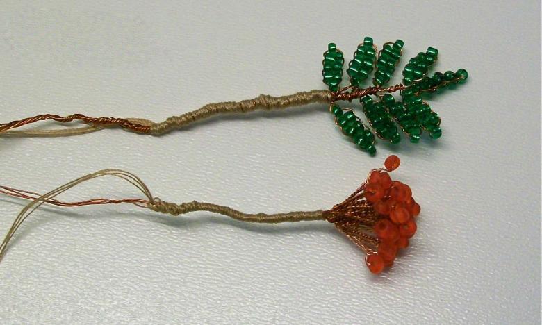 Pour fabriquer une branche de sorbier, vous avez besoin d'un fil de fer raidi. La brindille de départ est fixée à la base. Vous l'enroulez fermement autour du fil. En dessous, ajoutez d'autres brindilles. Un arbre complet est formé. Pour la beauté et la fiabilité, les points d'attache sont à nouveau enveloppés de fil.