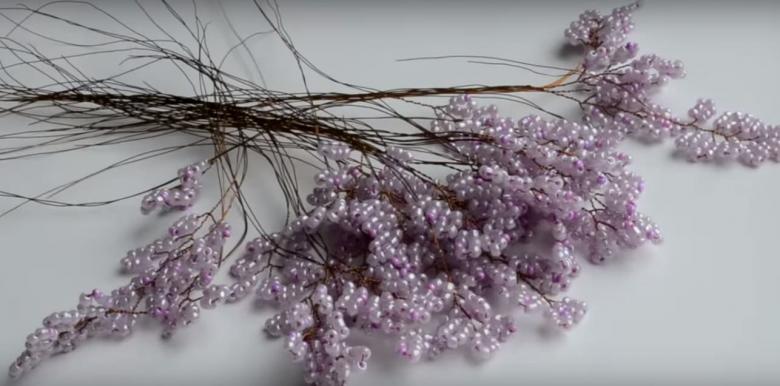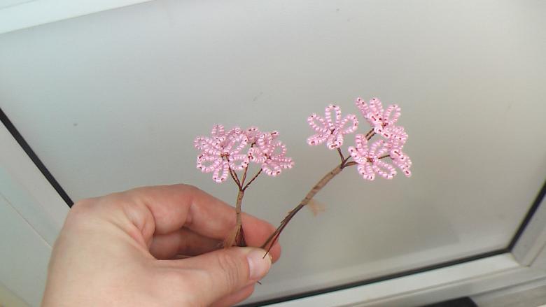 Pour former 1 branche du bouquet, on assemble 5 des fleurs réalisées. Tenez compte du fait que la torsion a lieu jusqu'aux branches terminales du fil. Cette commande devrait produire 24 rameaux.
