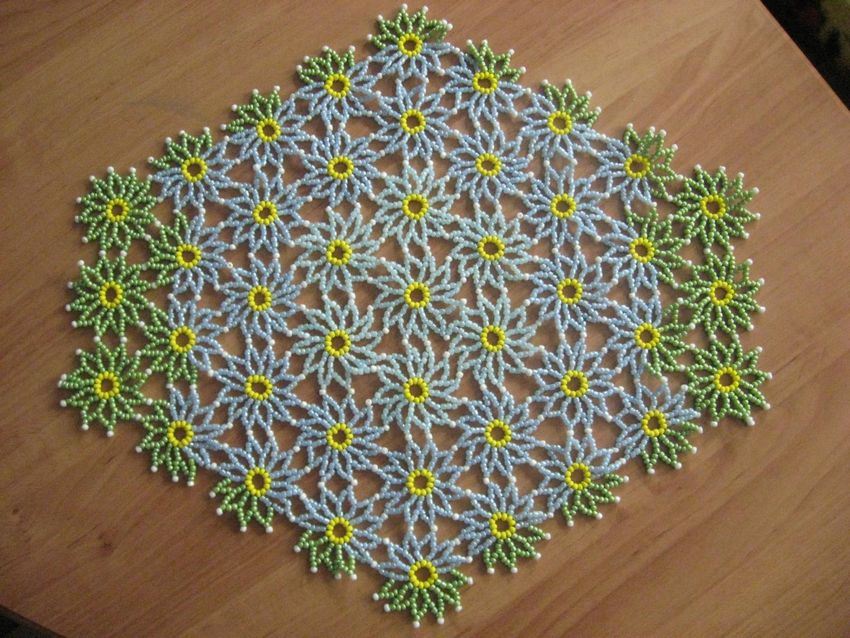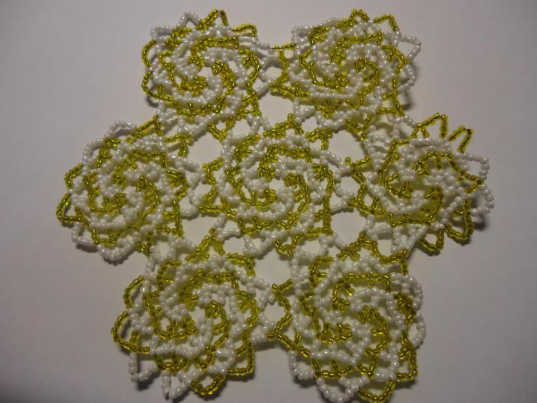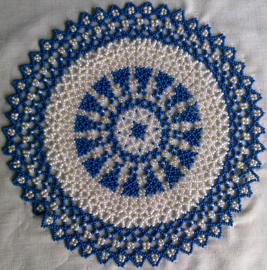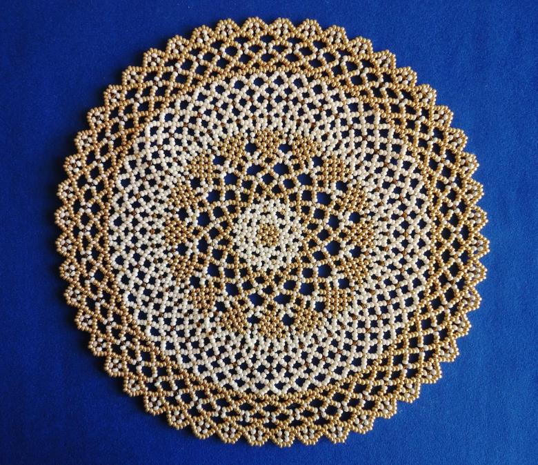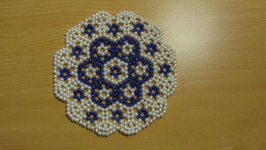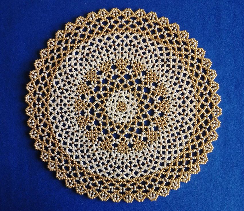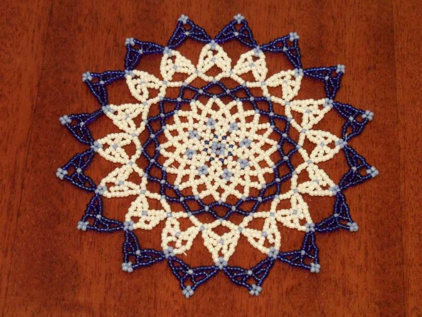 La serviette de table en perles Swirls est tissée en éléments individuels, qui sont réunis à la fin. Vous aurez besoin de deux couleurs de perles (par exemple, bleu et jaune) et de fil de pêche.