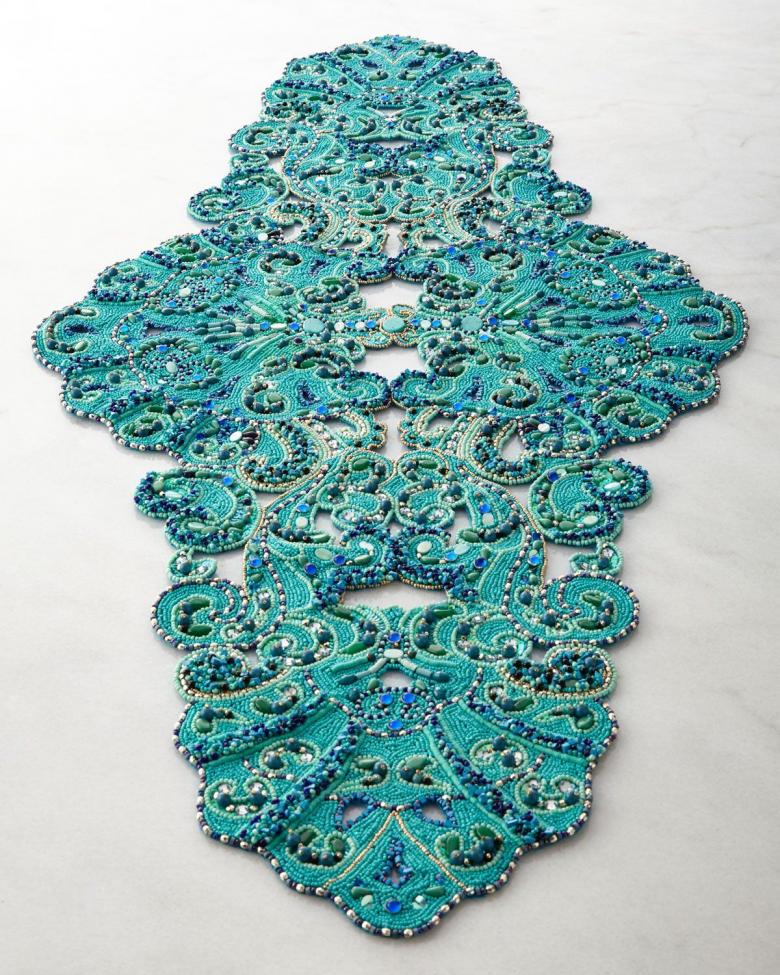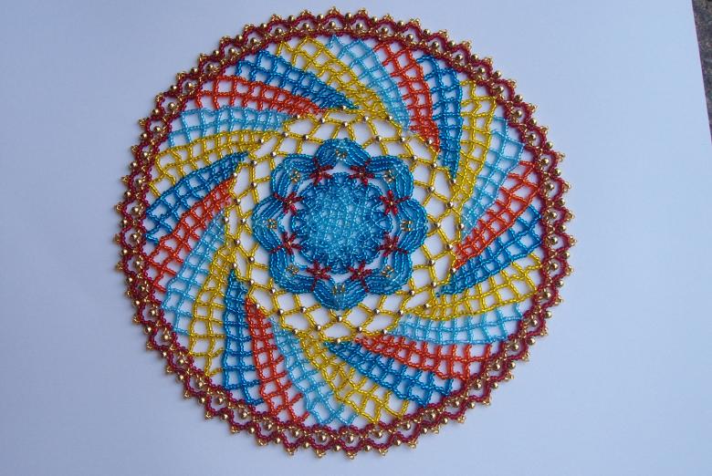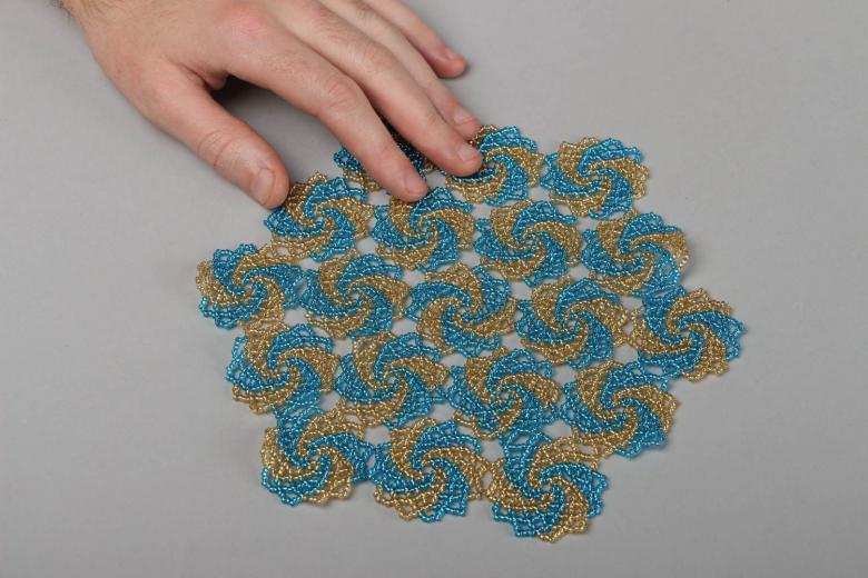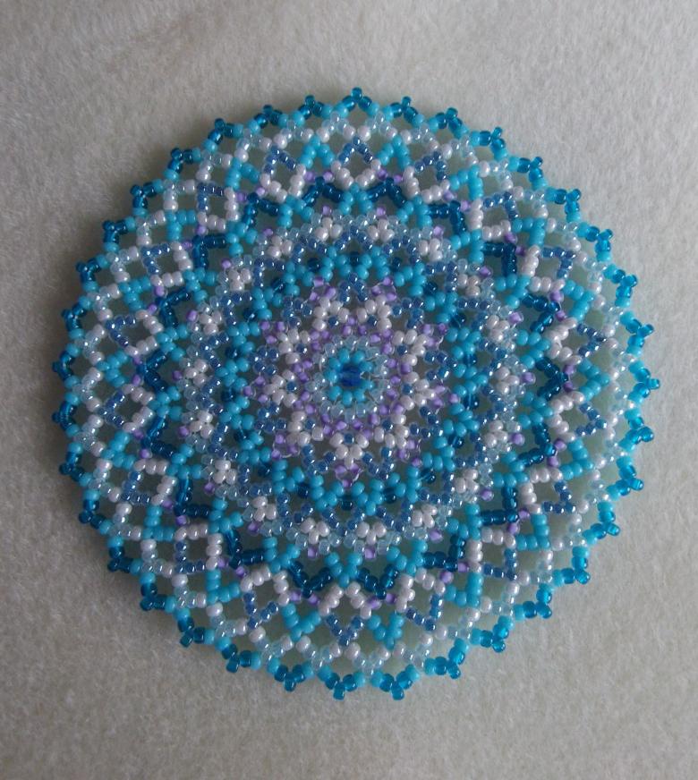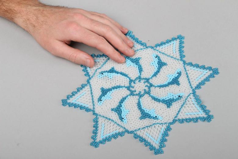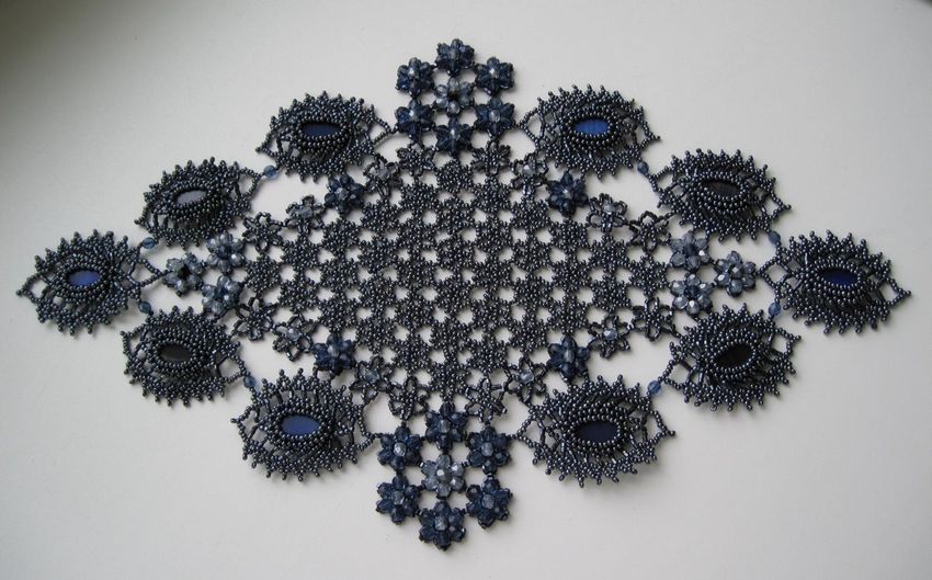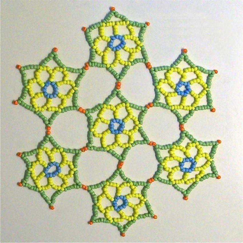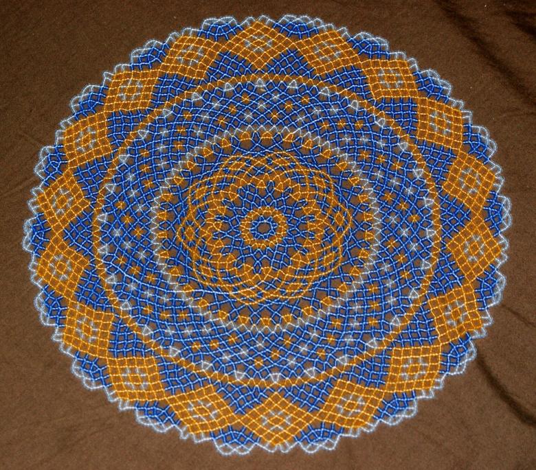 La serviette de table en perles Swirls est tissée en éléments individuels, qui sont réunis à la fin. Vous aurez besoin de deux couleurs de perles (par exemple, bleu et jaune) et de fil de pêche.