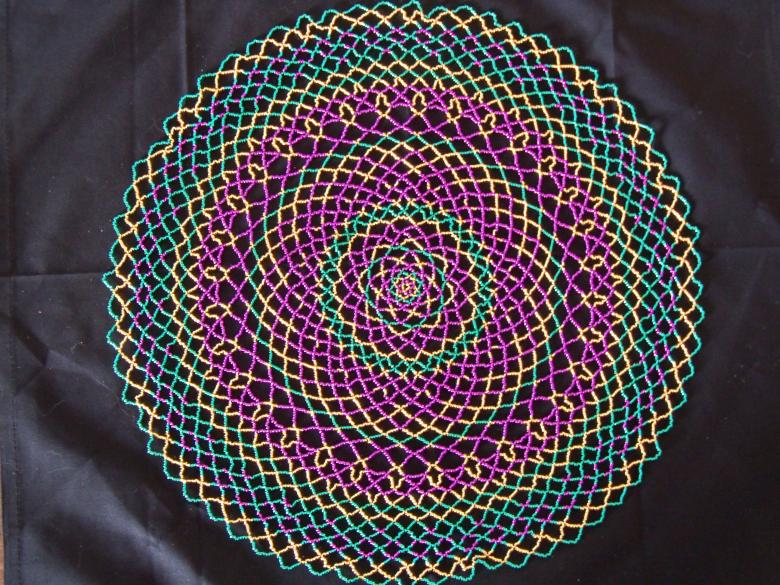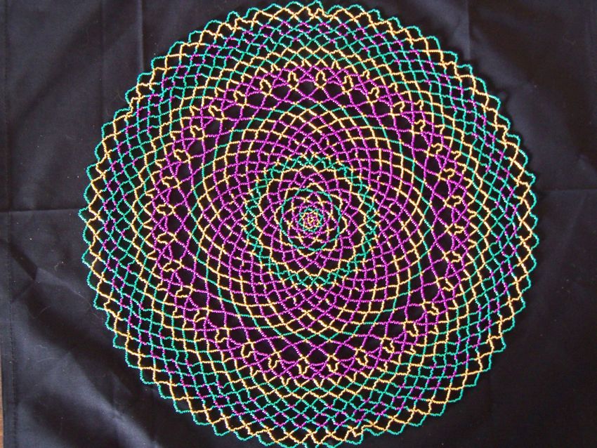 - La rangée suivante est composée uniquement de violet. Au sommet de chacun des 16 rayons est enfilé un fil avec 5 perles de verre.