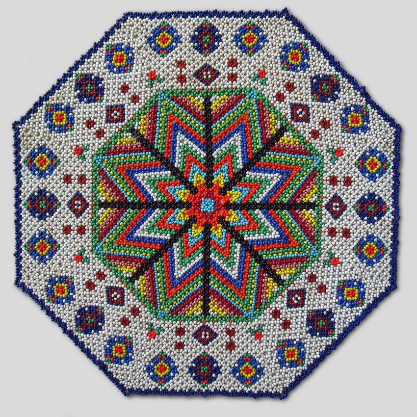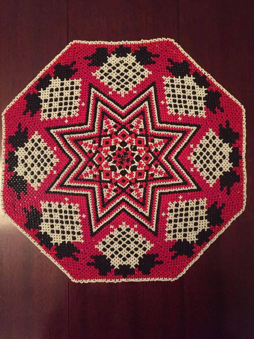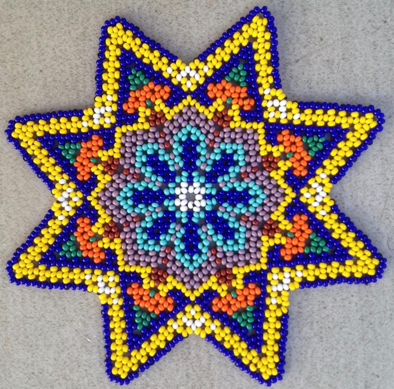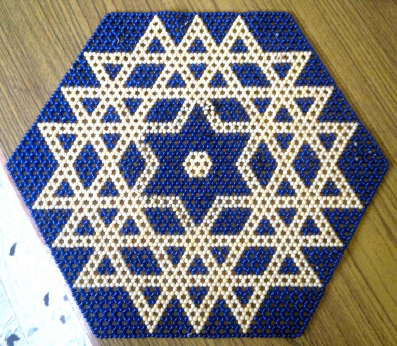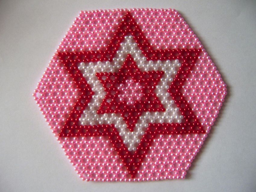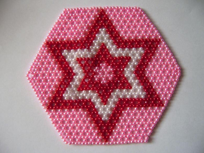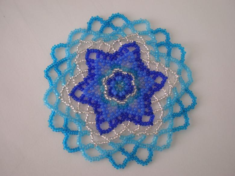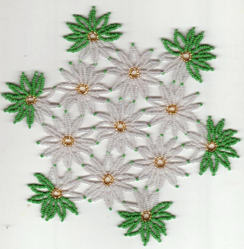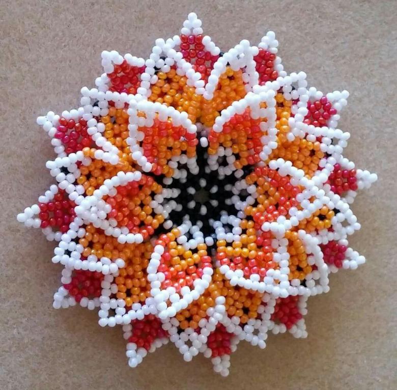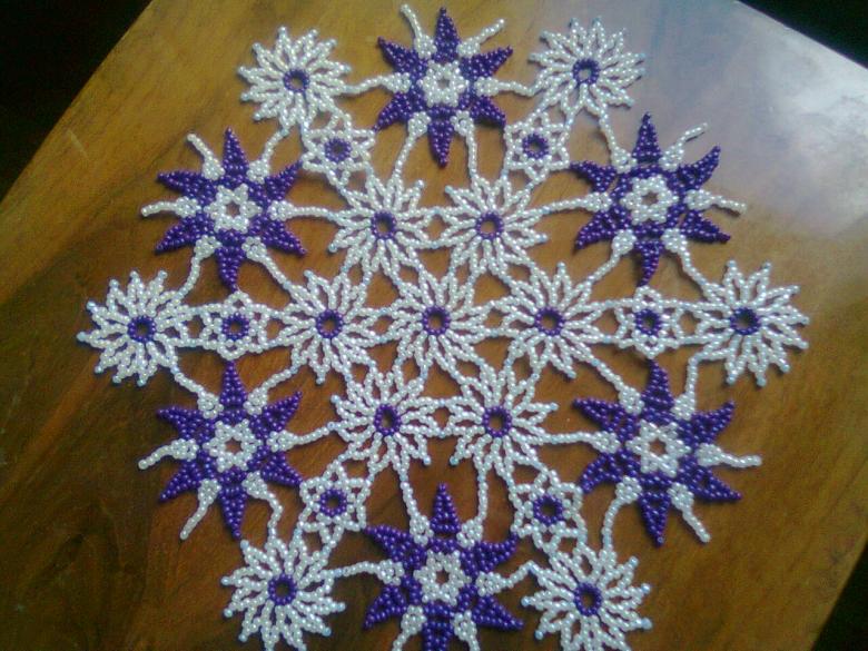 - Cinq perles blanches sont ensuite enfilées, et l'aiguille est enfilée dans la perle de verre blanche située devant la perle violette. Les cinq perles sont ensuite enfilées dans les trois. La bande de trois perles blanches et de cinq perles est ensuite répétée, en alternance. Une étoile aux rayons blancs et au centre violet se forme.