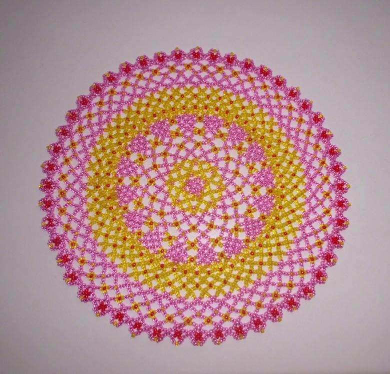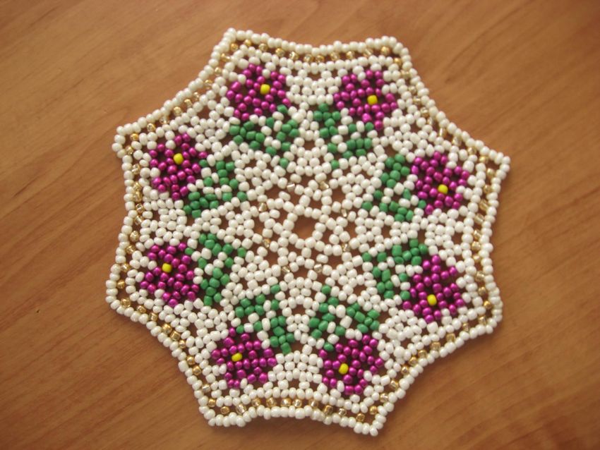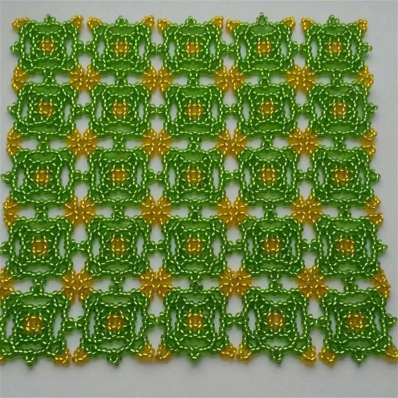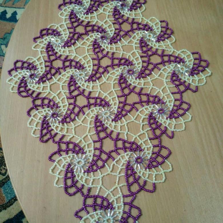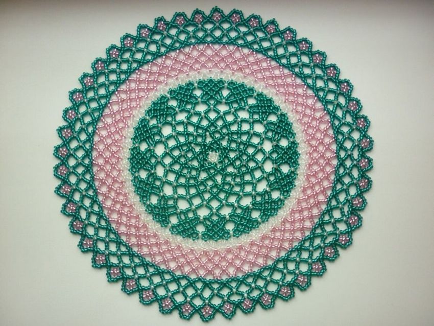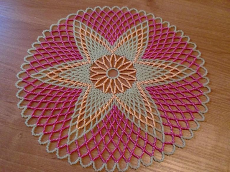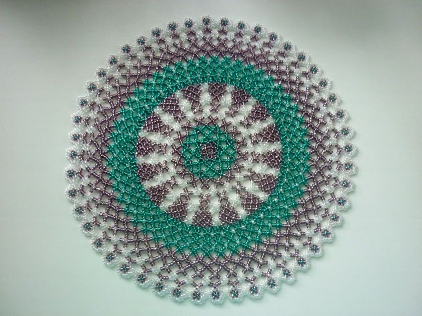- Commencez à tisser à partir du centre et remontez progressivement vers les bords. La taille de la pièce peut être déterminée par vous-même, elle dépend du nombre de perles utilisées.
