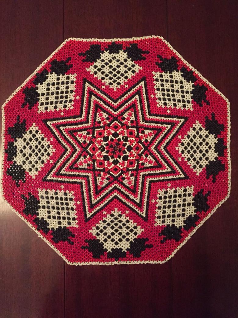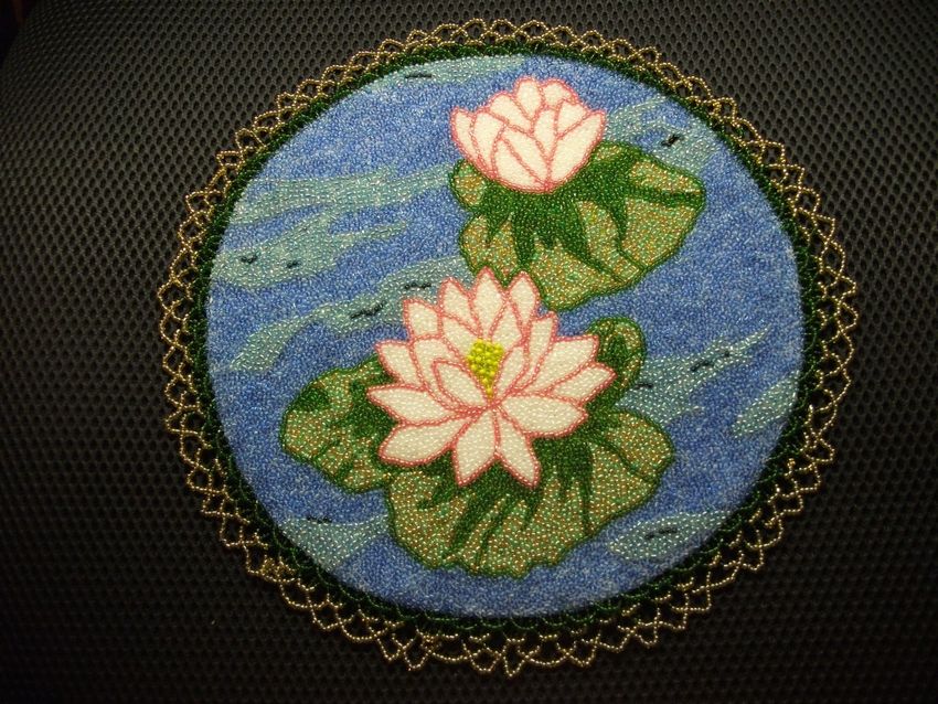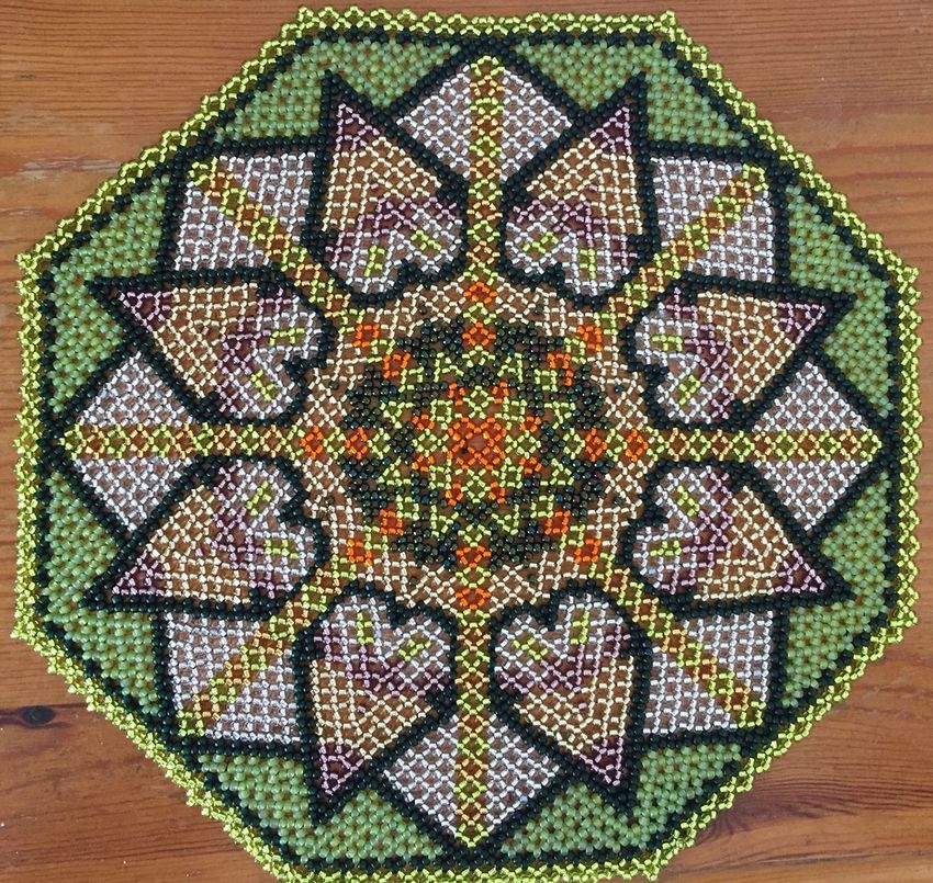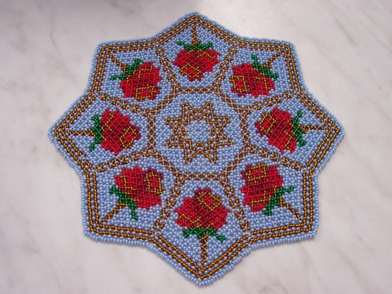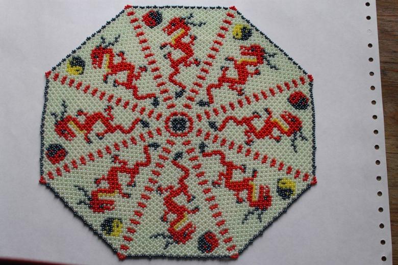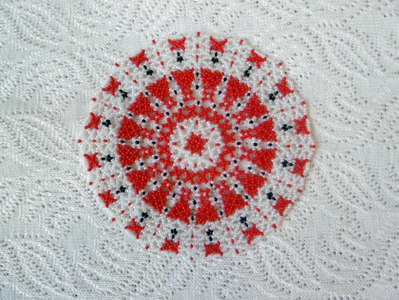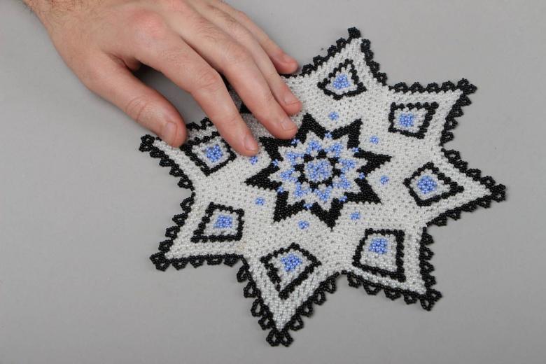 - Commencez à tisser à partir du centre et remontez progressivement vers les bords. La taille de la pièce peut être déterminée par vous-même, elle dépend du nombre de perles utilisées.