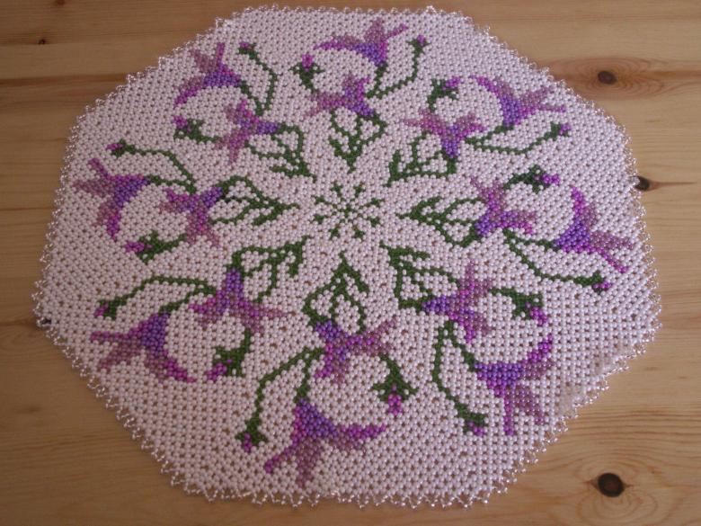 - Ensuite, on enfile 5 perles (quatre blanches et une violette au milieu), le fil est enfilé devant la perle de verre violette du rang précédent. Une nouvelle fois, une bande de trois perles est réalisée et le schéma se poursuit de la même manière. Le résultat est de 16 rayons.
