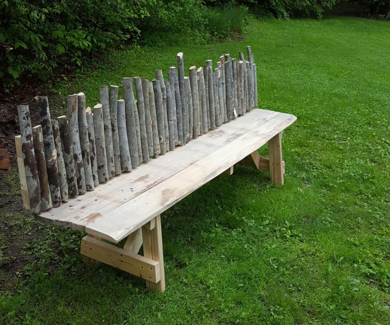 - Les pieds avant sont faits de rondins et les pieds arrière, qui soutiennent également le dossier, sont faits de deux rondins ou d'un rondin de plus petit diamètre scié en deux morceaux de même hauteur.
