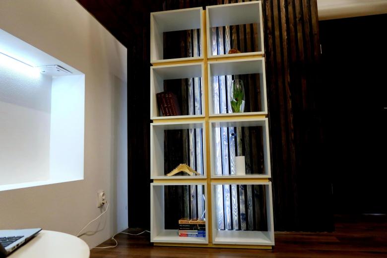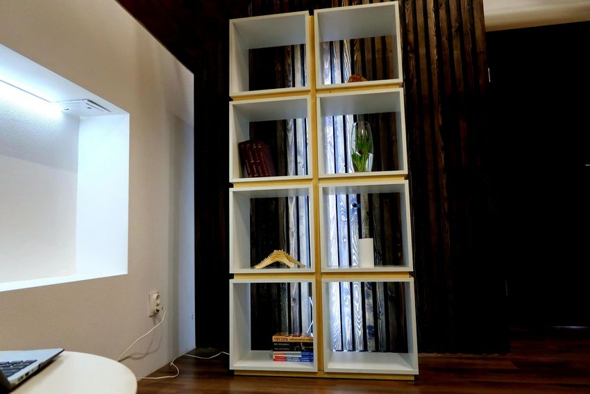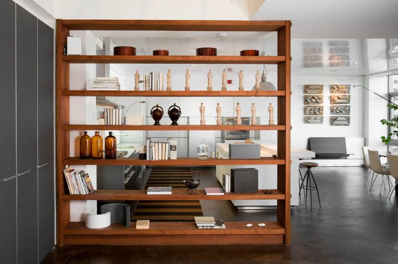 Les étagères au décor attrayant peuvent être utilisées comme meubles pour diviser les pièces, par exemple pour séparer la cuisine du salon dans un studio.