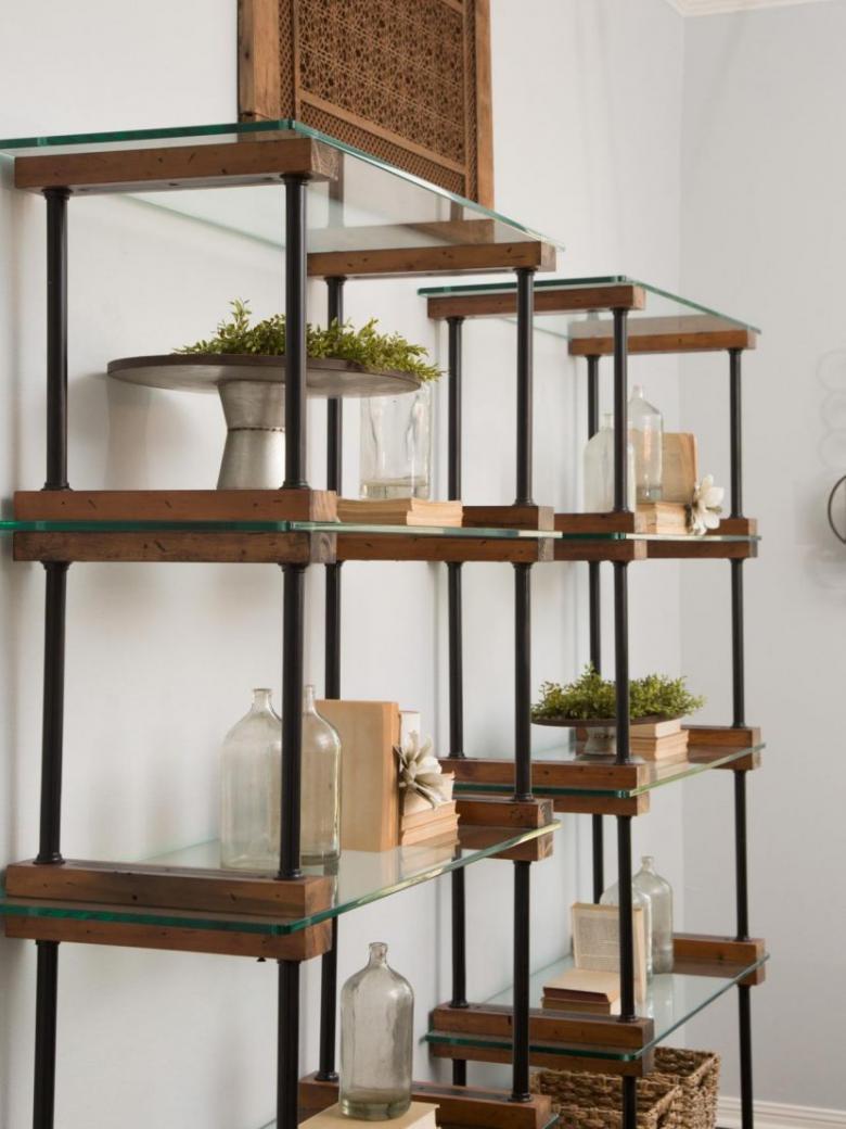 Une étagère en bois fabriquée de vos propres mains est la meilleure façon de travailler. Les inserts et les façades en plastique, les cadres métalliques et les étagères en verre trempé sont des combinaisons réussies largement utilisées.