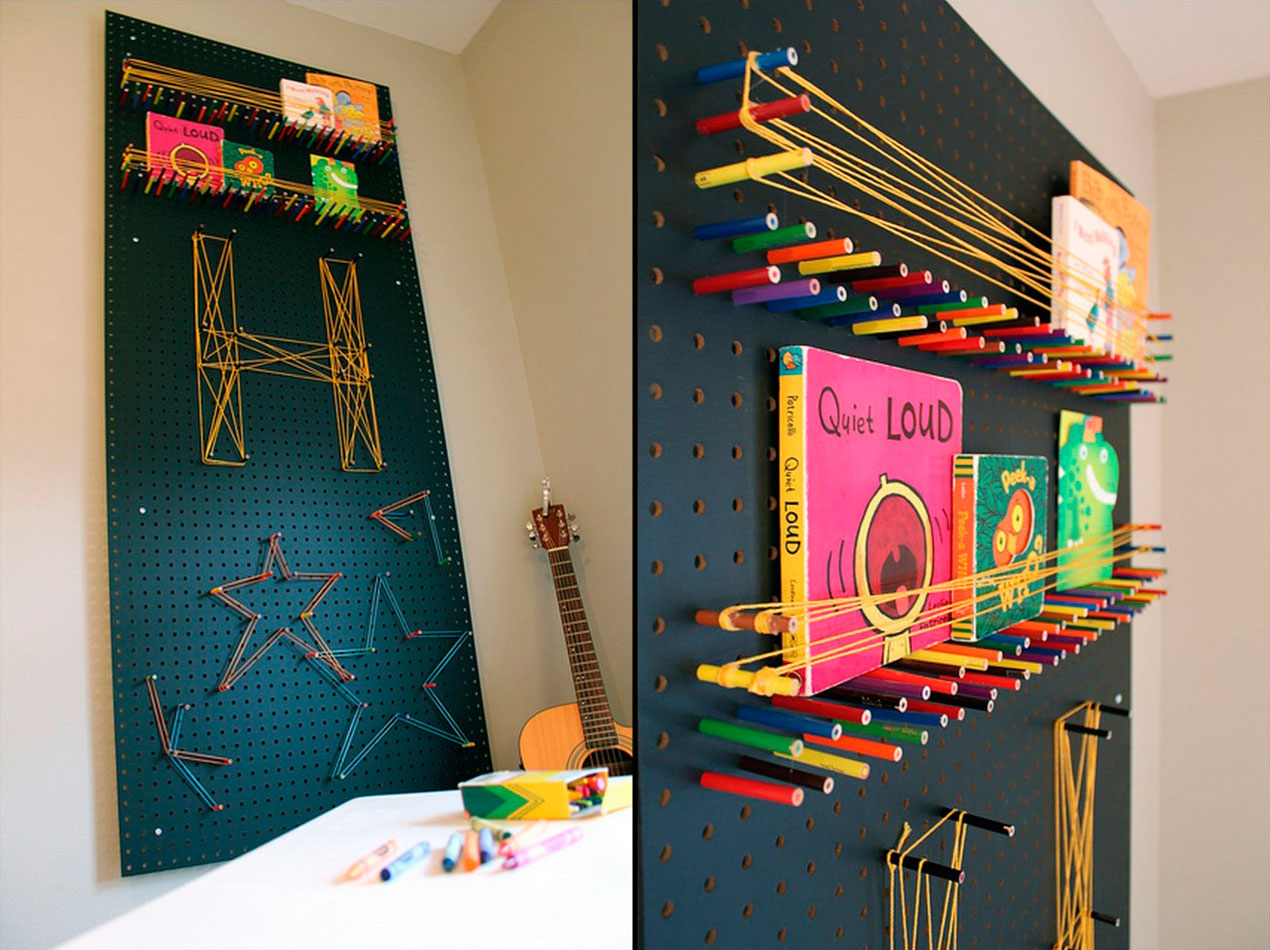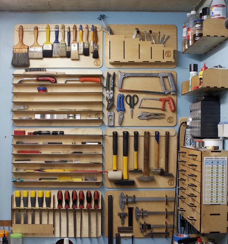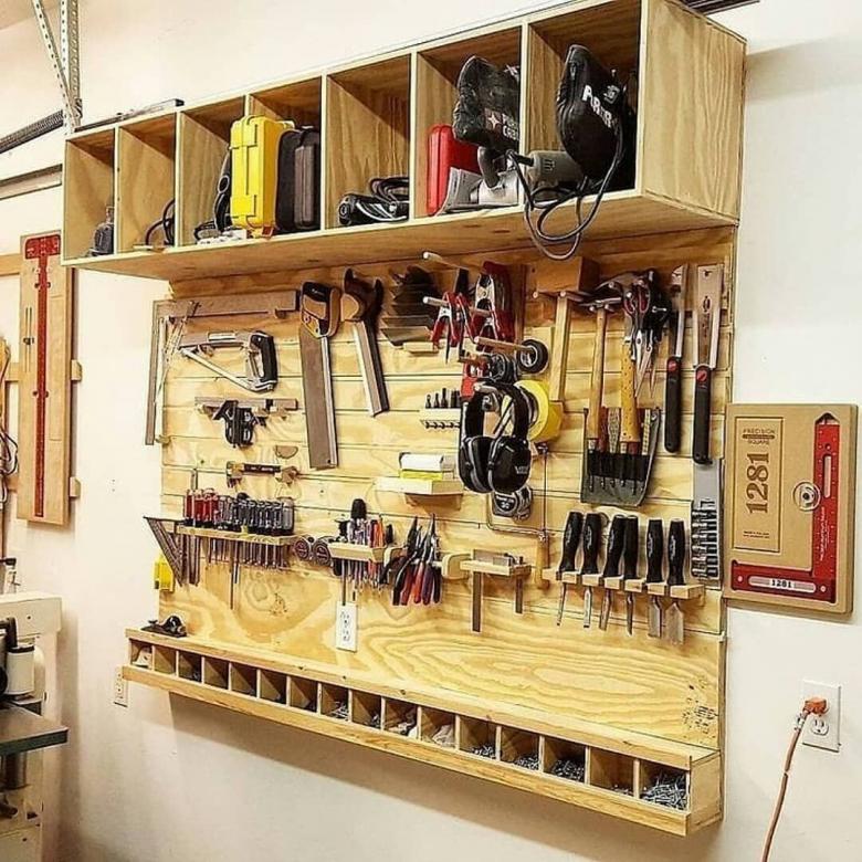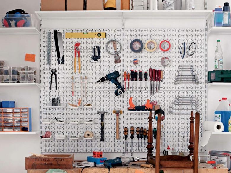 Les étagères permettent de ranger les boîtes de clous et de vis et les petits outils électriques. Les bandes magnétiques, les feuilles perforées font également un bon travail de rangement des outils et ont un aspect agréable.