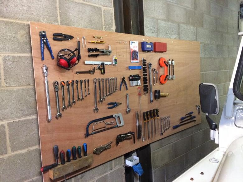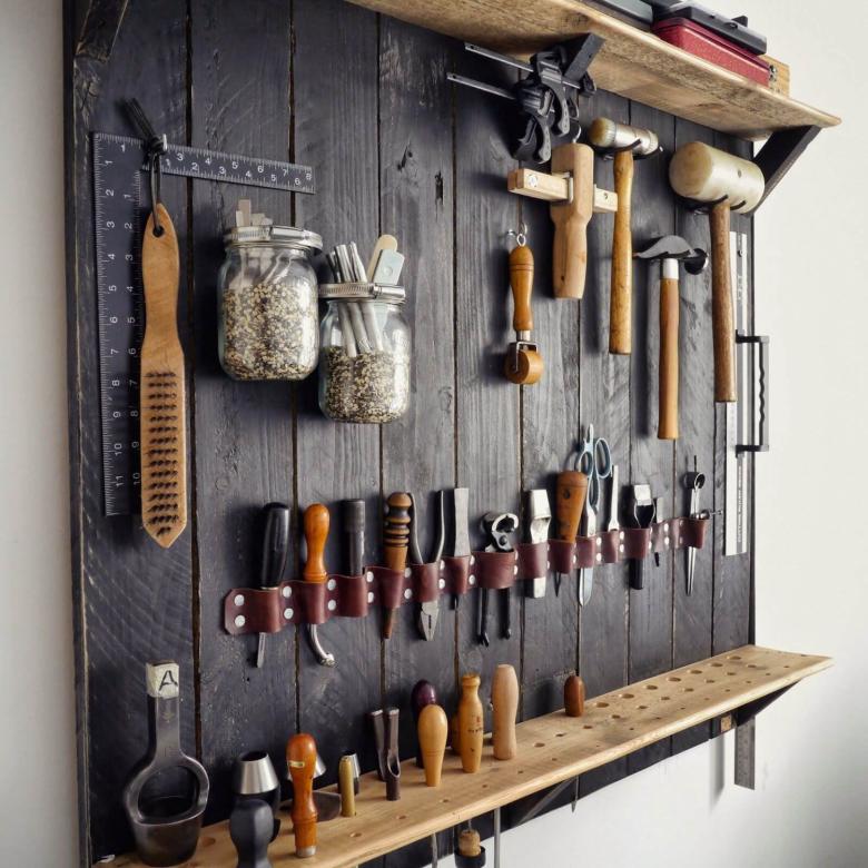 Les matériaux les plus fréquemment utilisés sont le bois ou le contreplaqué. Pour ranger les tournevis et les clés à fourche, la perceuse crée des trous à la même hauteur, espacés à intervalles réguliers pour accueillir tous les outils. Les crochets permettent de ranger des outils plus grands (marteau, pinces, scie à métaux).