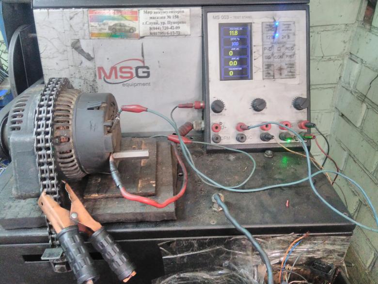 Un moteur électrique est connecté et la tension est régulée à 14V (sortie du générateur). Le rotor tourne jusqu'à 5000 tr/min. Le générateur fonctionne pendant 2 minutes, après quoi la sortie de courant est mesurée. L'alternateur doit être réparé si son courant de sortie est inférieur à 44A.