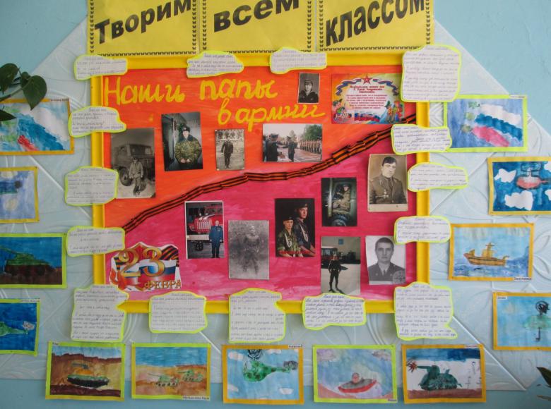 Tout d'abord, il est nécessaire de choisir un arrière-plan. Les matériaux utilisés sont la peinture, le papier coloré et le tissu. La couleur de fond peut être kaki (camouflage), des couleurs vives (rouge, orange) ou les couleurs du drapeau national. L'imagination des élèves peut et doit être mise à contribution pour remplir l'espace - leurs dessins et leurs travaux manuels sur le thème de la guerre s'intégreront très bien à l'image d'ensemble.