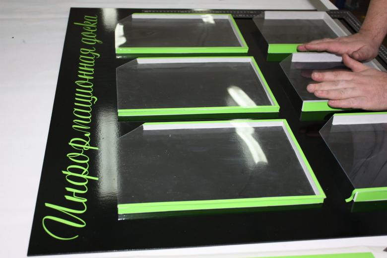 Pour les pochettes, dans lesquelles les feuilles sont placées, vous pouvez utiliser de simples dossiers transparents, mais les pochettes en plexiglas sont plus esthétiques. Il est important de répartir correctement les poches sur la surface du stand afin qu'il n'y ait pas trop d'espace libre d'un côté.