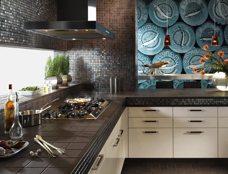 Une autre option réussie est l'utilisation de carreaux cassés pour les plans de travail de la cuisine, dont le motif donne finalement une texture unique. Le long et minutieux travail de pose et de tri des motifs de différentes couleurs et tailles permet d'obtenir un plan de travail vraiment unique et visuellement attrayant, qui présente une totale individualité.