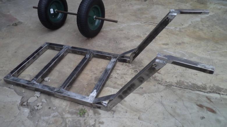 Les roues de motos sont les meilleures, mais d'autres exemples peuvent bien sûr être utilisés. Plus les roues sont grandes, plus il sera facile et confortable de déplacer le chariot. Il est préférable de fabriquer le fond de la poussette à partir de vieilles tôles.